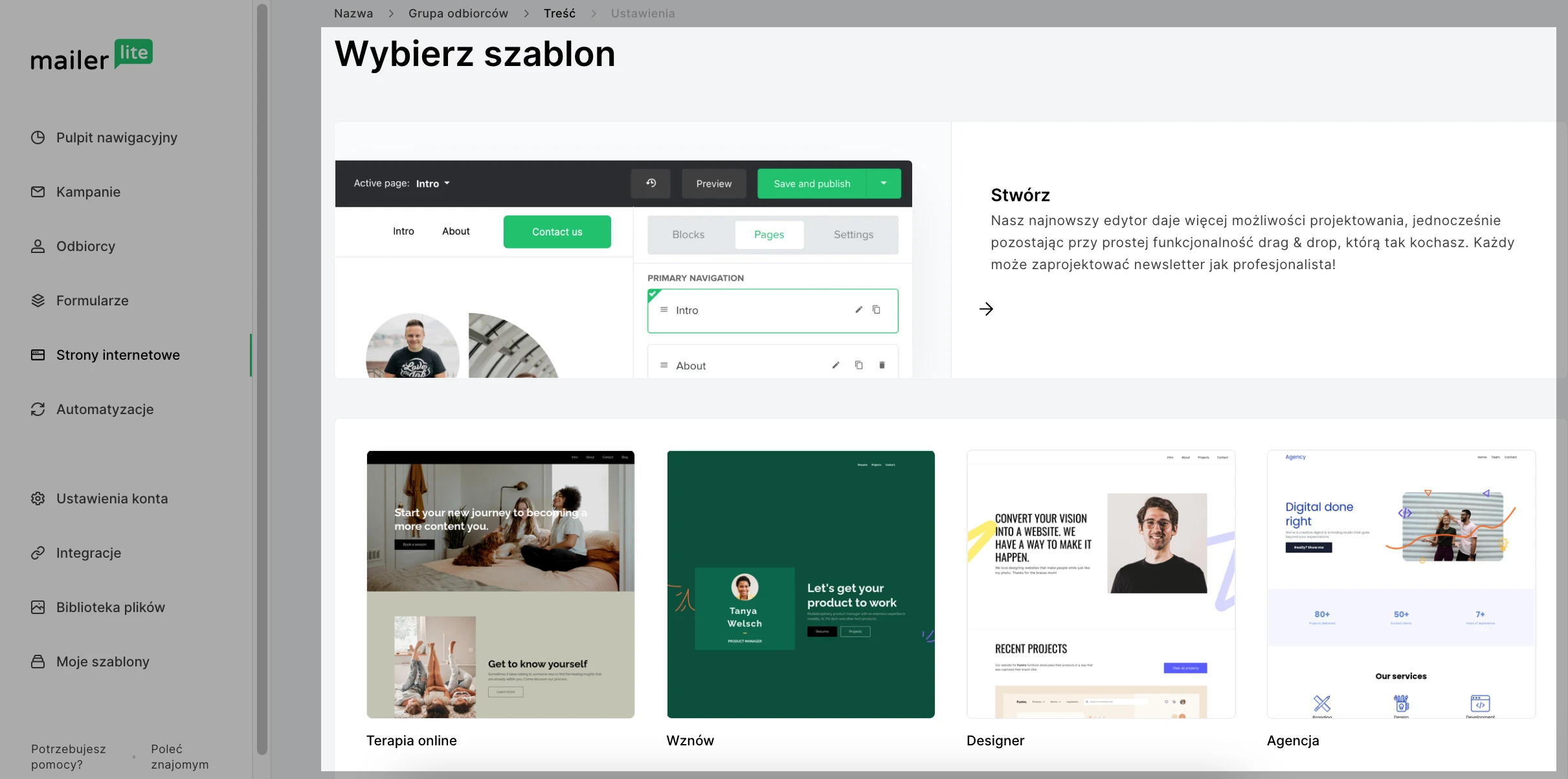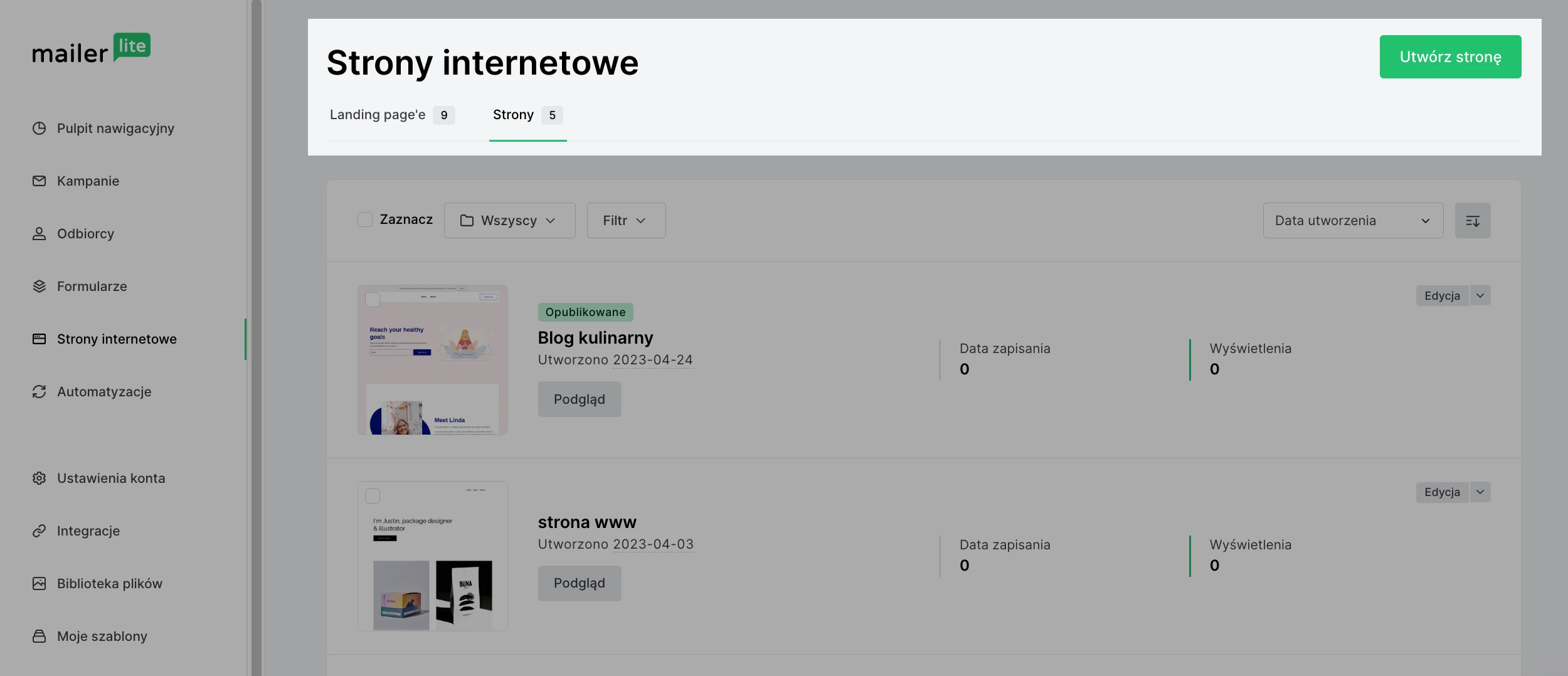 Wszystkie konta MailerLite mogą tworzyć i publikować pięciostronne strony internetowe za pomocą naszego kreatora stron. Darmowe konta są mają możliwość utworzenia jednej, podczas gdy konta w ramach planu Growing Business lub Advanced mają nieograniczoną liczbę stron internetowych do wykorzystania.