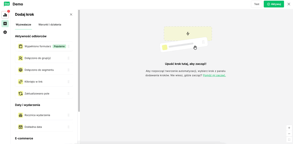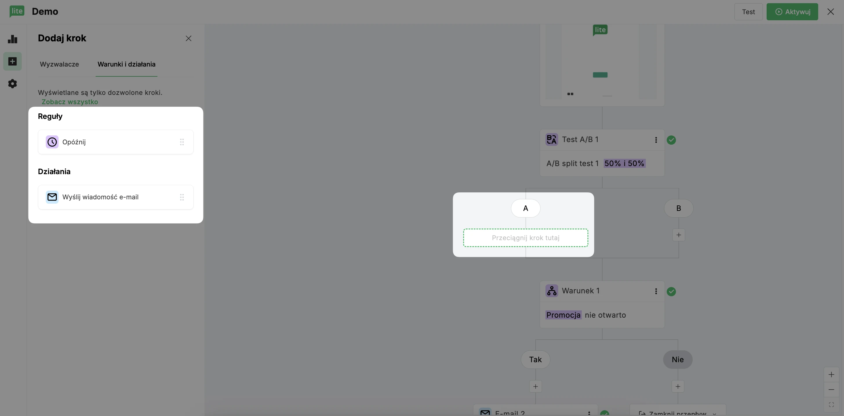 2. Kliknij ikonę + i przeciągnij krok Testy A/B do Twojej automatyzacji wybierając go z menu po lewej stronie ekranu.