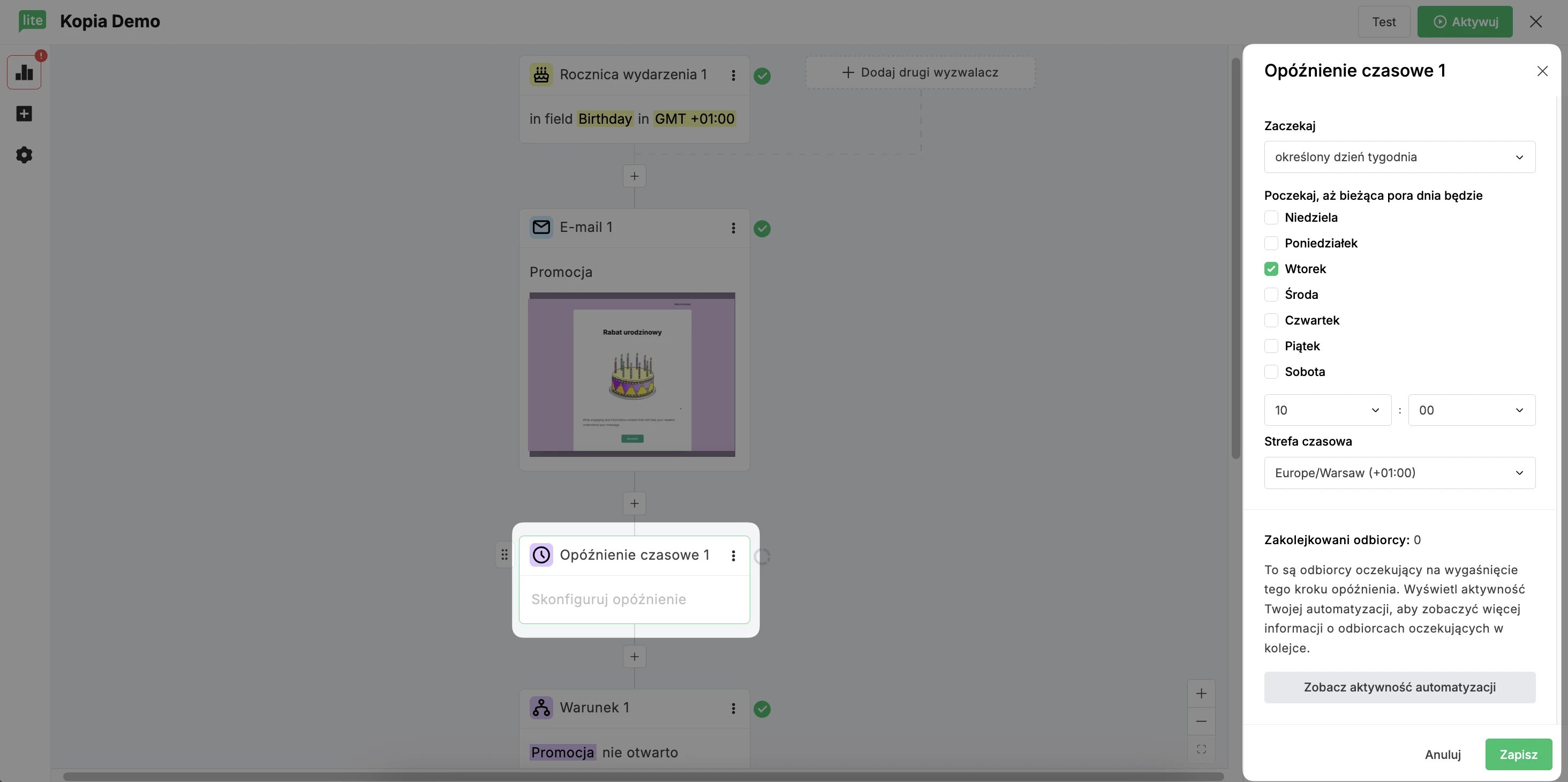Przykładowo, jeśli chcesz, aby odbiorcy, otrzymywali e-maile z automatyzacji tylko we wtorki, możesz dodać określony dzień tygodnia: we Wtorki Etap opóźnienie przed każdym e-mailem.