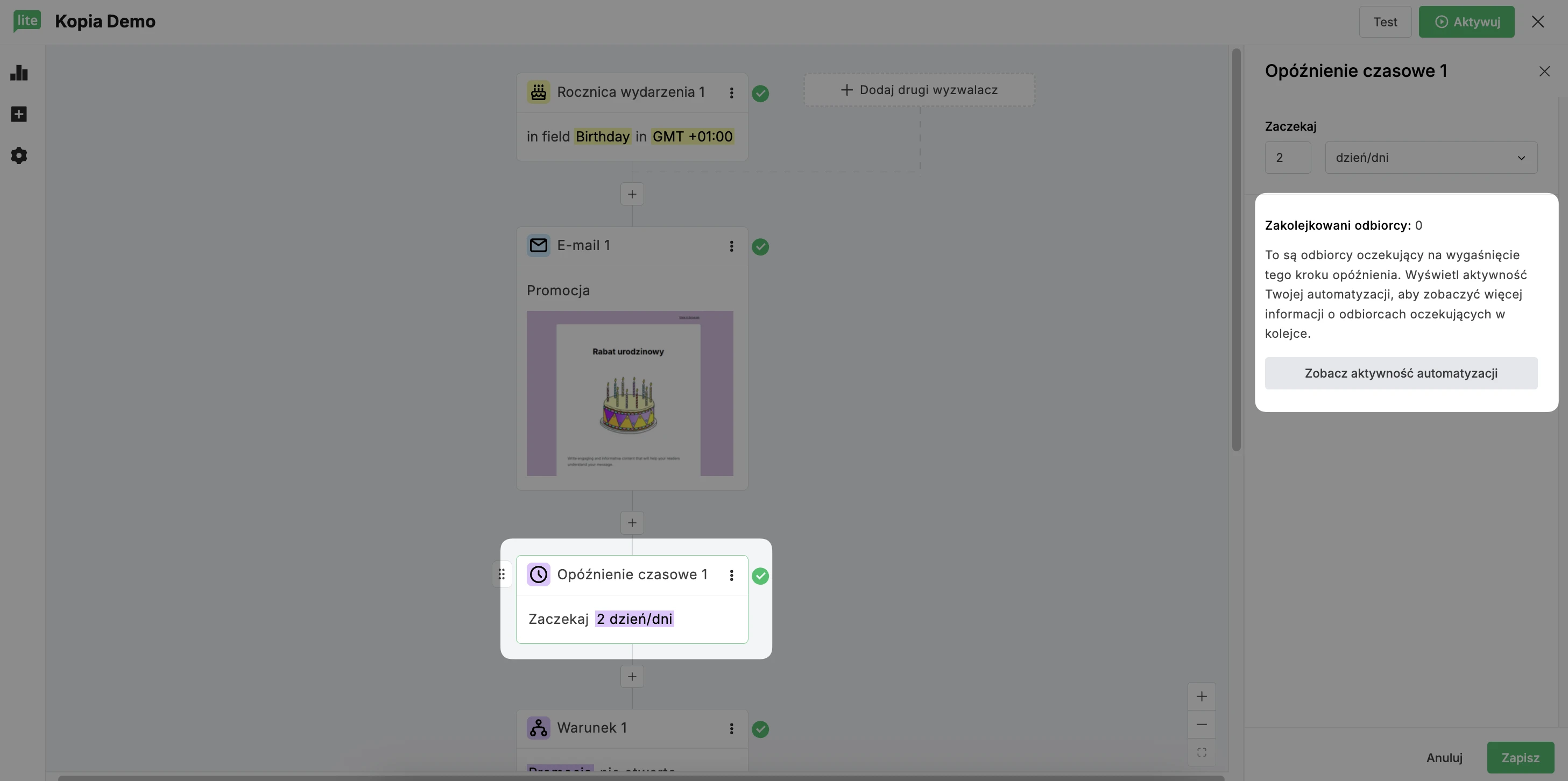 Jeśli chcesz po prostu pominąć etap opóźnienia dla niektórych odbiorców, to możesz to zrobić w zakładce aktywność automatyzacji.