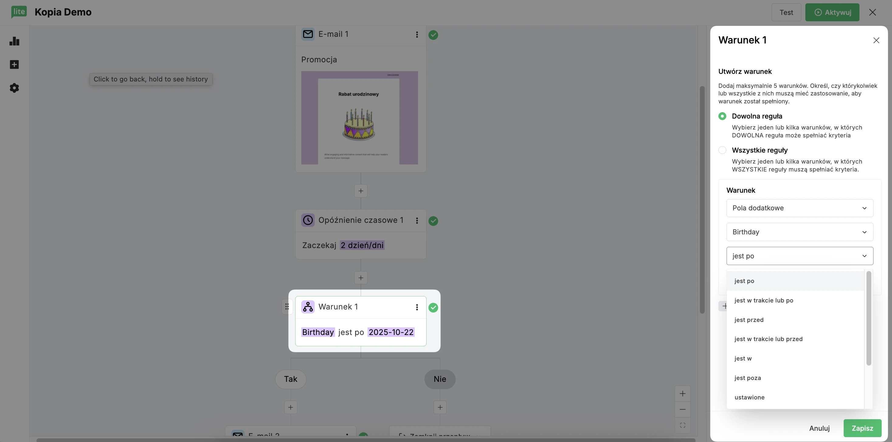 Krok warunkowy jest bardzo rozbudowaną funkcją, która pozwala na podzielenie ścieżki zdarzeń na dwie różne odnogi w oparciu o określoną przez Ciebie regułę.