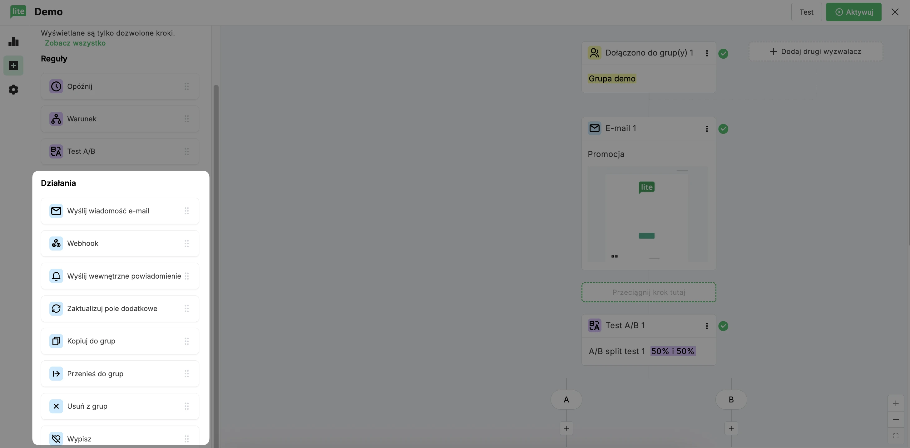 Otworzy się panel boczny po lewej stronie, pokazujący różne opcje Reguł i Działań. Reguły pomagają kontrolować sposób, w jaki odbiorcy przechodzą przez workflow, natomiast działania określają, co dzieje się z odbiorcami, gdy przechodzą przez ten workflow.