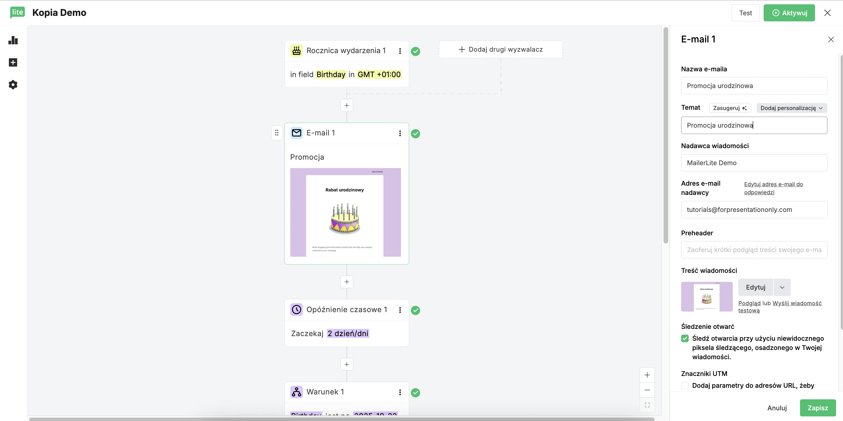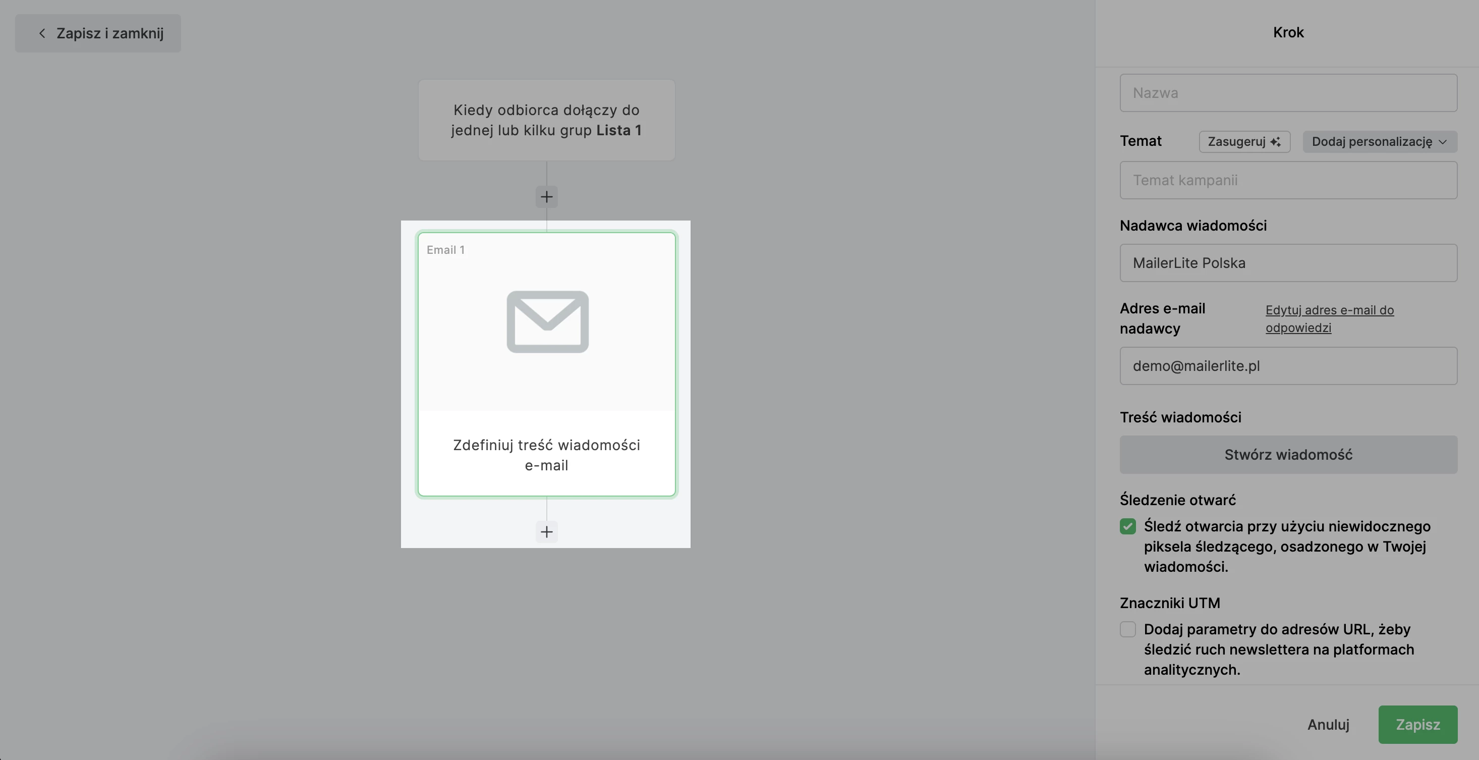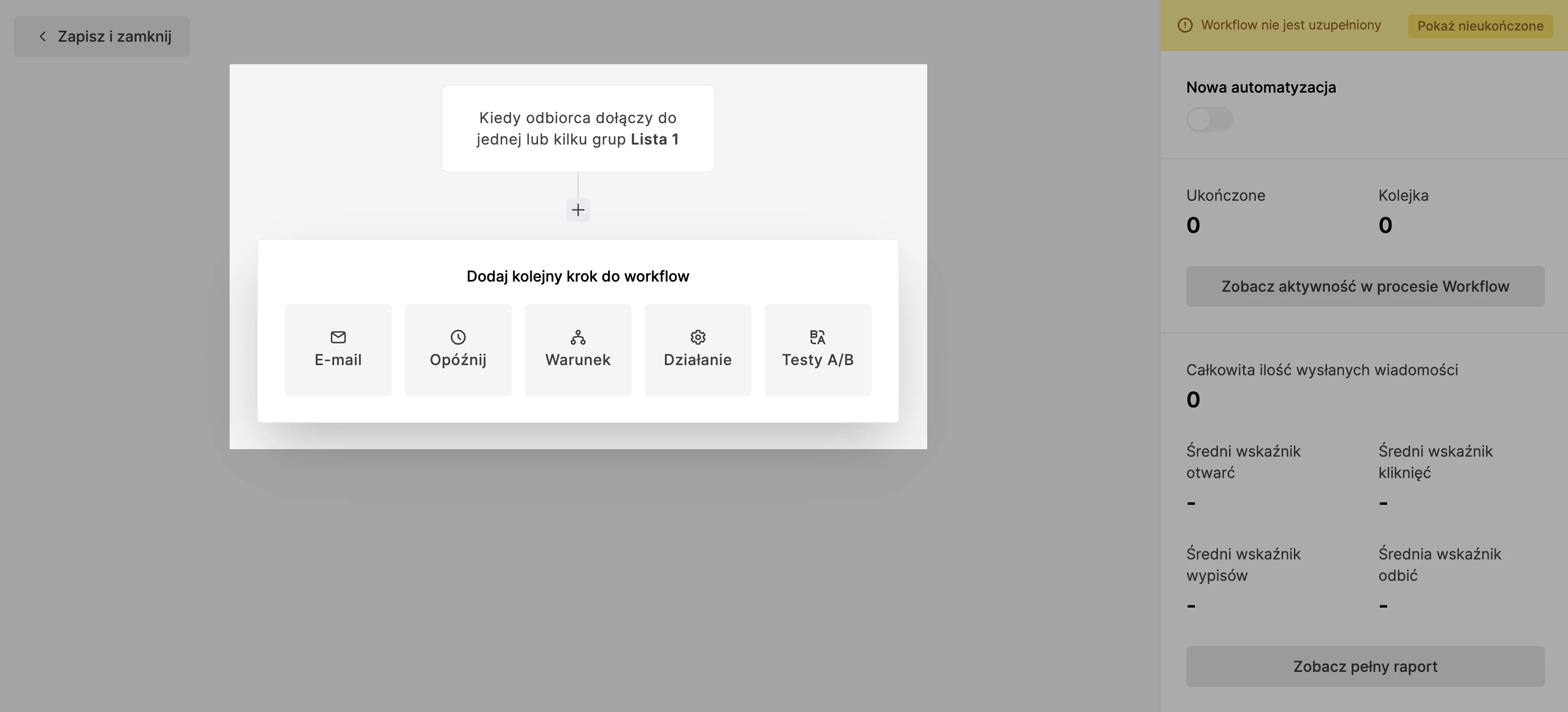 Krok e-mail, pozwala na dodanie do workflow wiadomości e-mail, która będzie wysyłana automatycznie, gdy subskrybenci znajdą się na tym etapie. Może to być na przykład e-mail powitalny, e-mail z ofertą lub nawet zautomatyzowany e-mail urodzinowy.