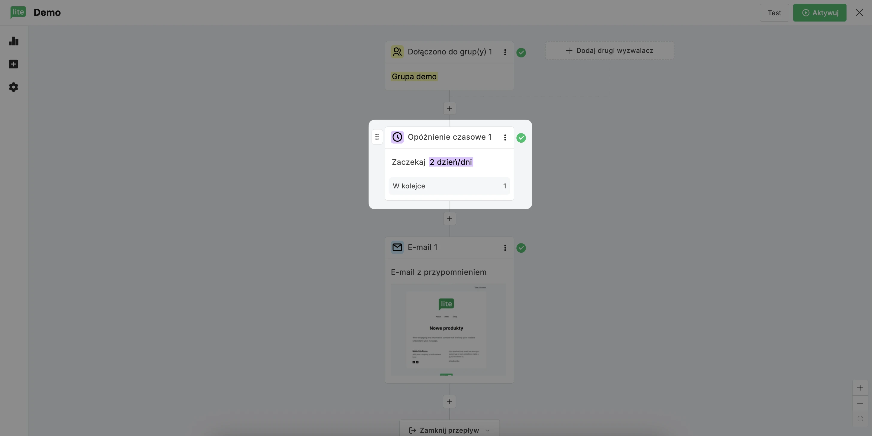 Pozwala on na dodanie przerw przed lub pomiędzy etapami. Na przykład, jeśli masz trzy wiadomości e-mail w swoim cyklu wysyłek i chcesz, aby każda z nich została wysłana w odstępie jednego tygodnia, to wystarczy, że dodasz etap Opóźnienie o jeden tydzień, pomiędzy każdym krokiem e-mail.
