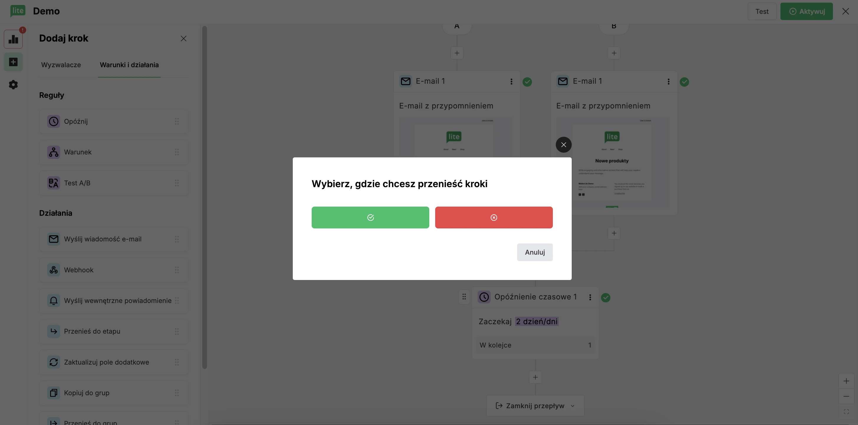 Obecnie możesz zmieniać kolejność kroków dotyczących wiadomości e-mail, opóźnień, działań, webhooków, warunków i testów A/B. Aby przenieść krok:
