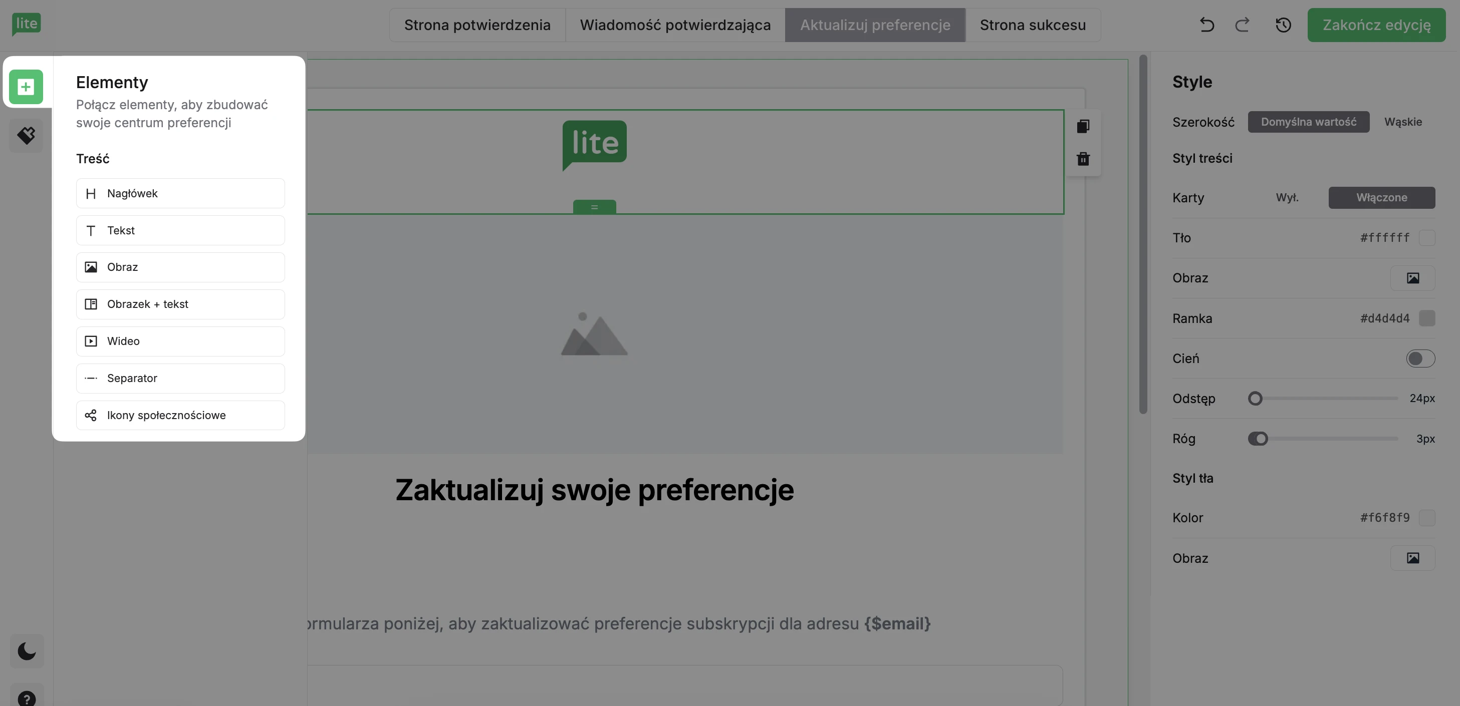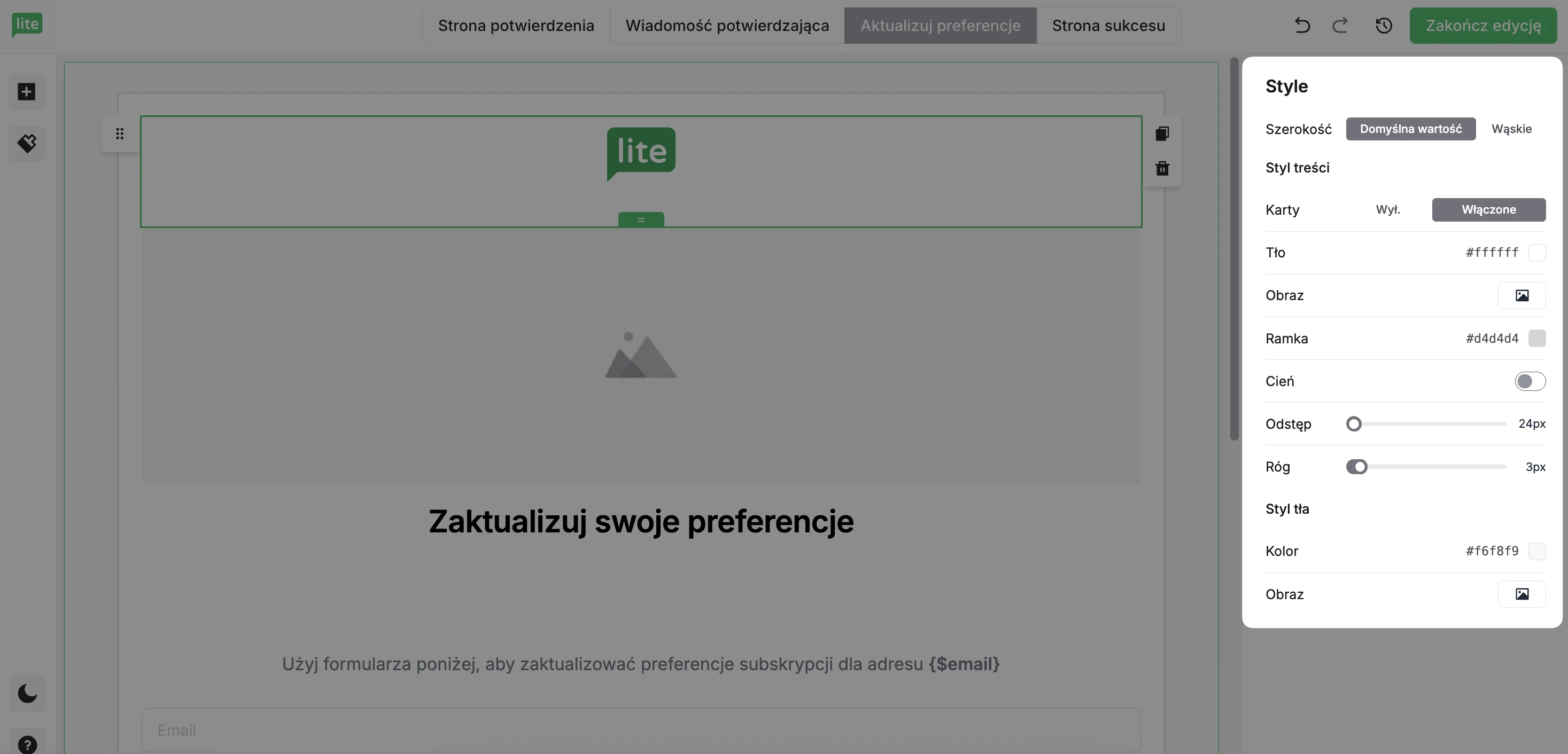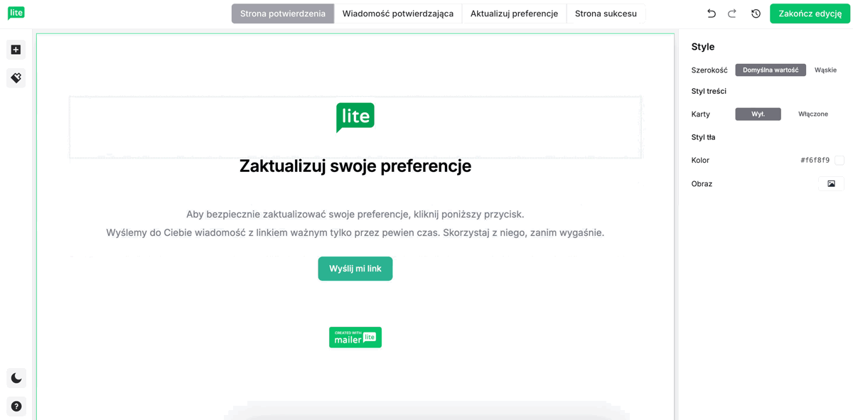 Możesz edytować i projektować te strony, aby dopasować je do Twojego centrum preferencji e-mailowych i do Twojej marki.