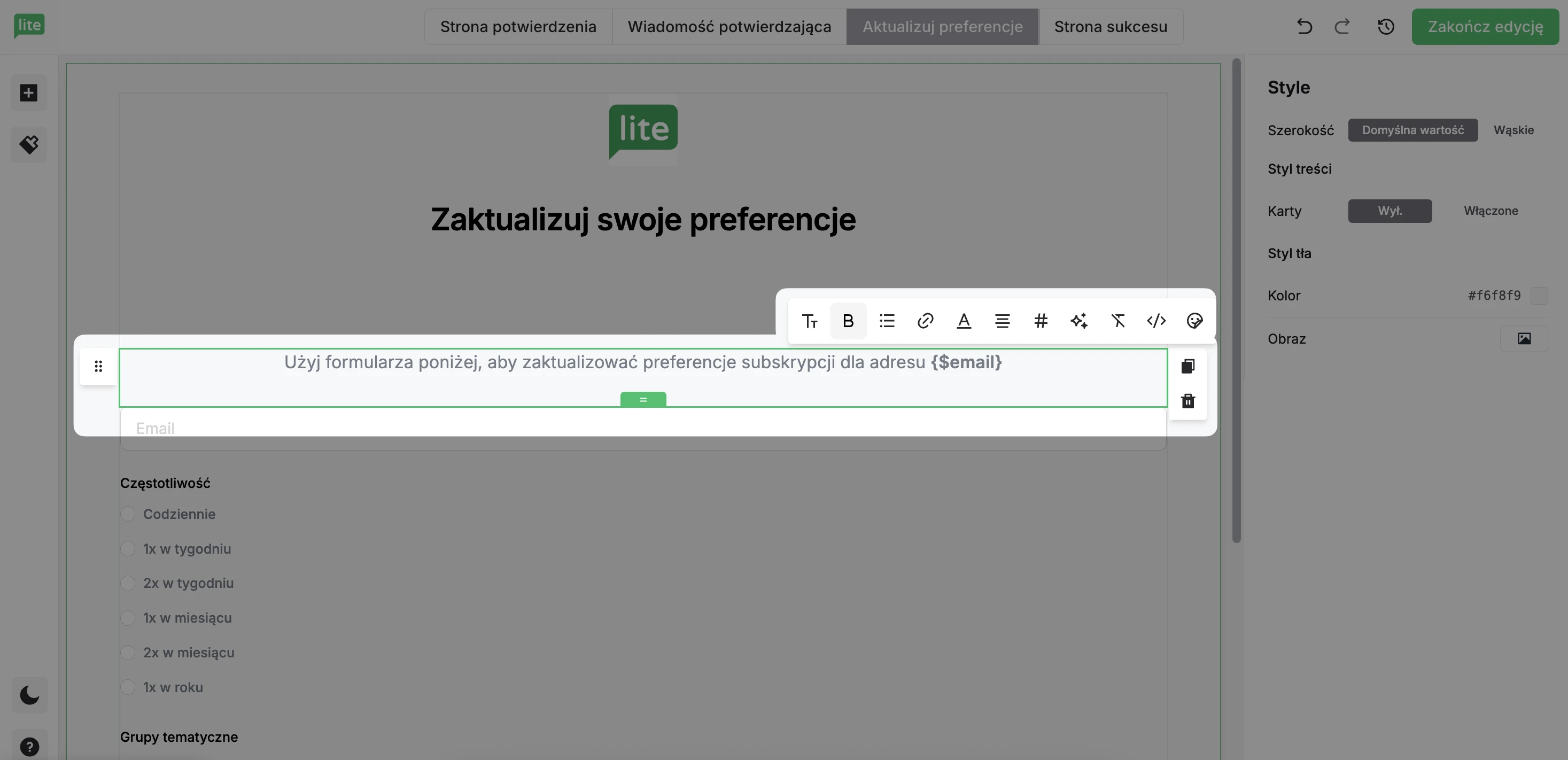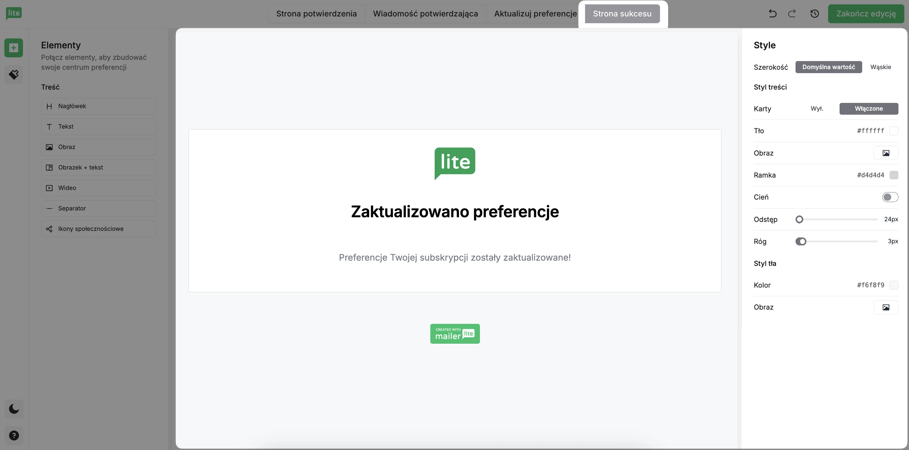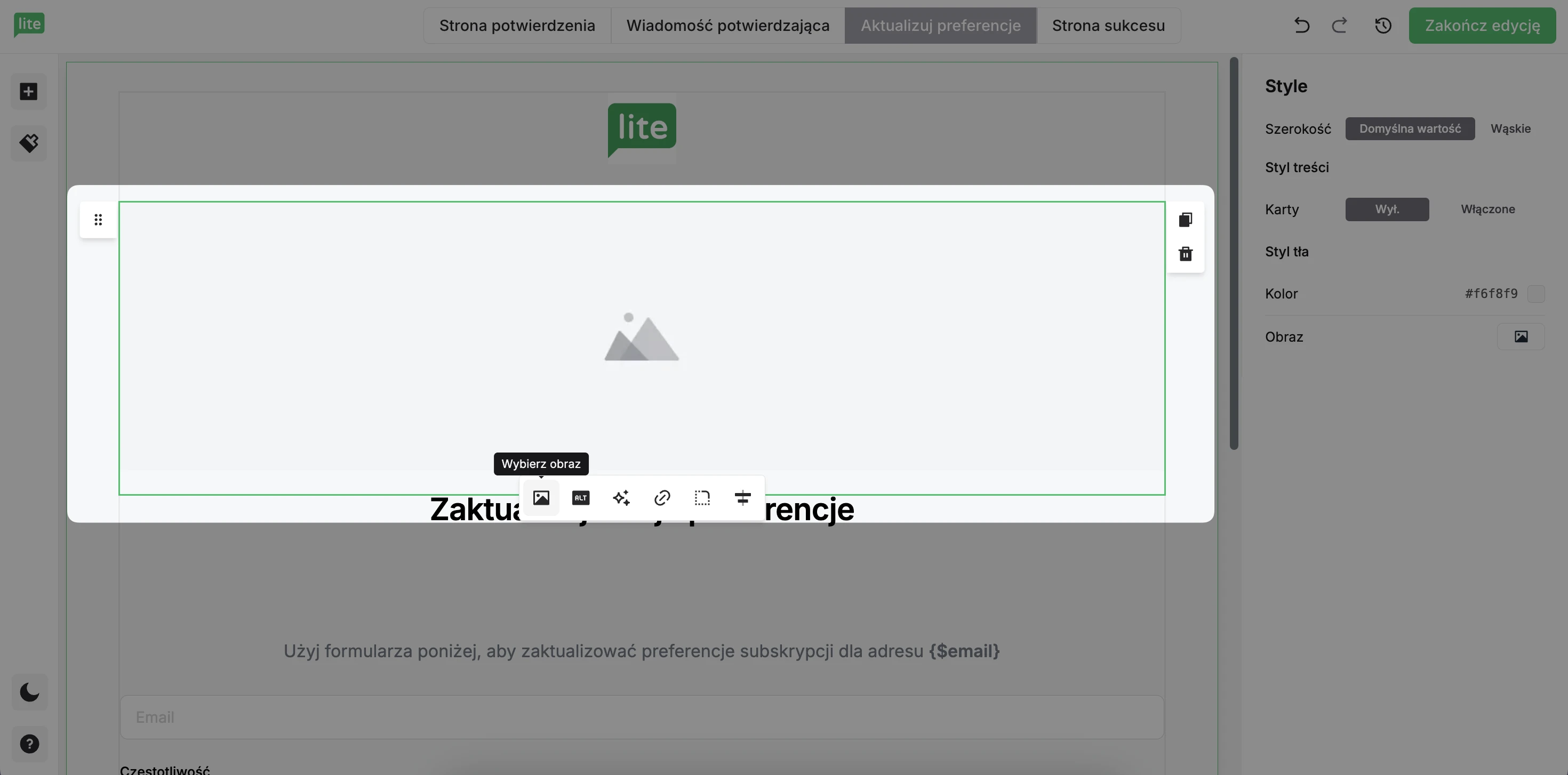 Możesz edytować i projektować te strony, aby dopasować je do Twojego centrum preferencji e-mailowych i do Twojej marki.