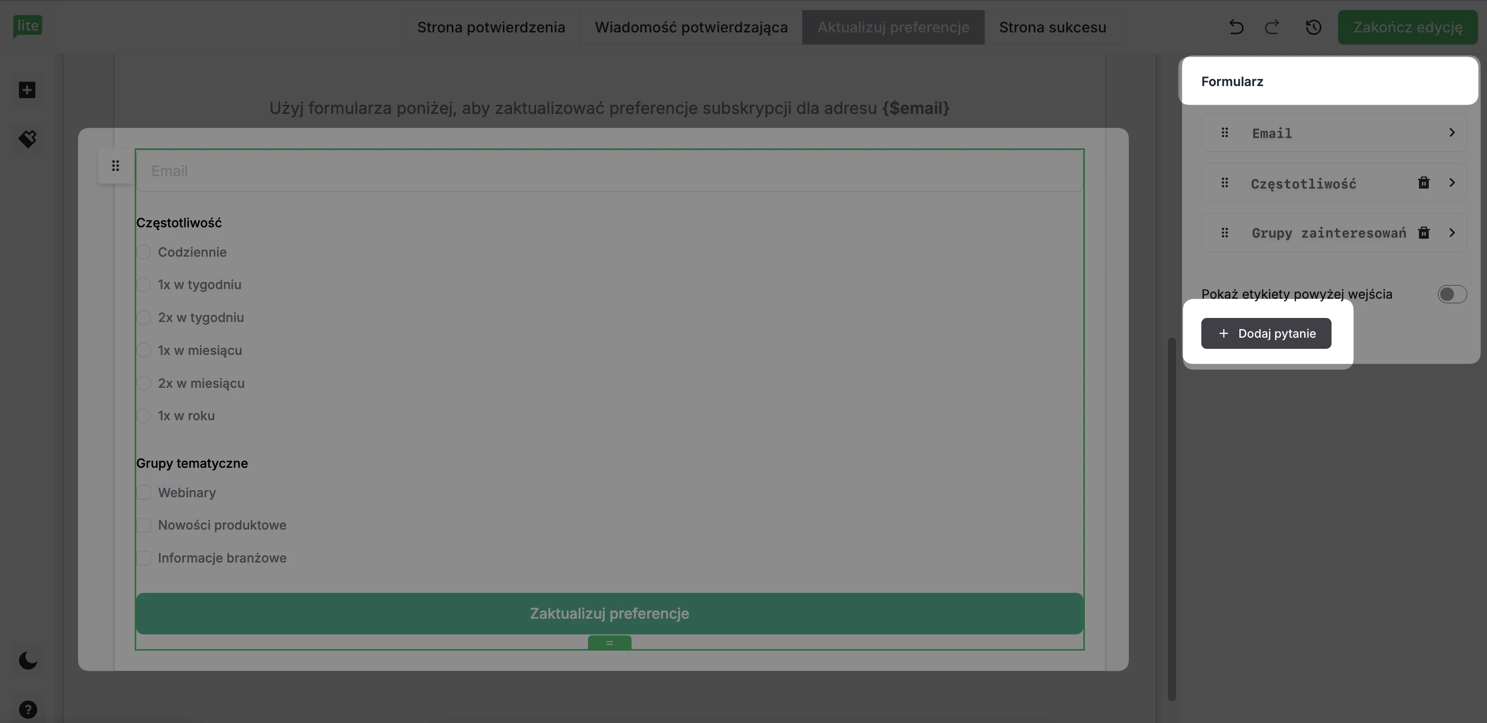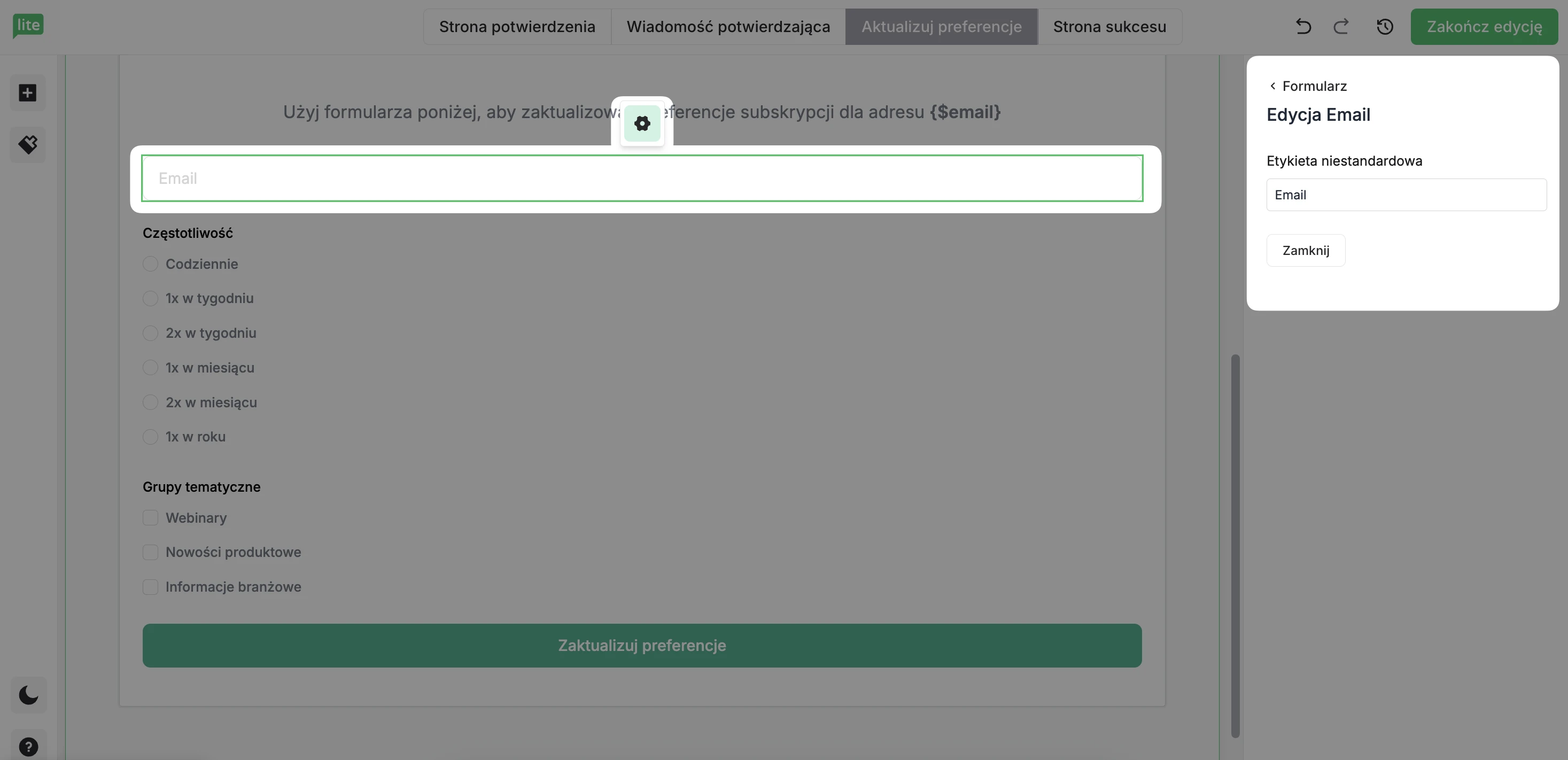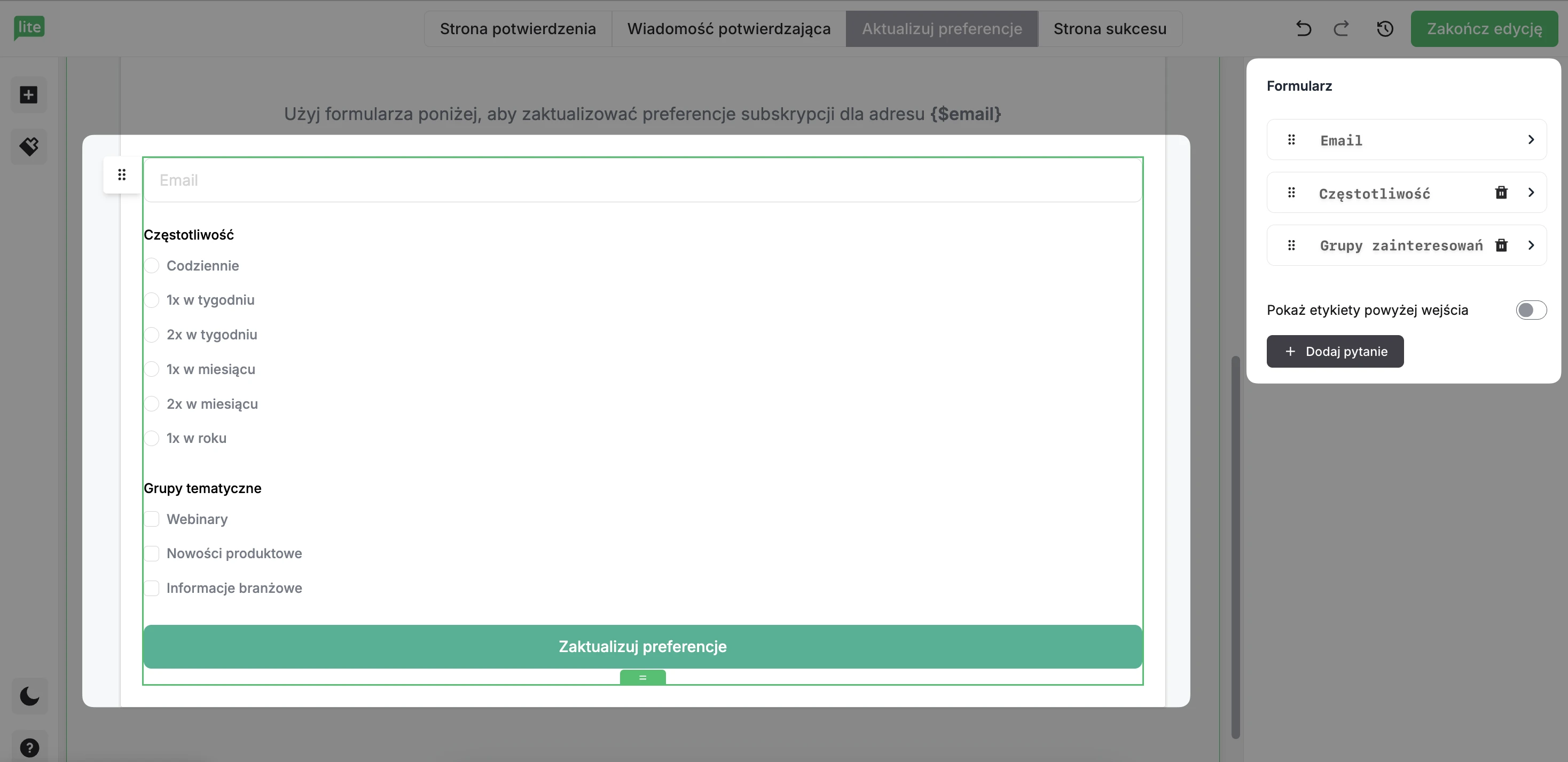W edytorze Centrum preferencji znajdują się cztery zakładki: Strona potwierdzenia, Wiadomość potwierdzająca, Aktualizuj preferencje i Strona sukcesu. Zakładka Aktualizuj preferencje zawiera główny formularz, Strona sukcesu pojawia się po pomyślnym przesłaniu formularza, Wiadomość potwierdzająca to wiadomość e-mail, którą odbiorca otrzymuje na swoją skrzynkę odbiorczą, a Strona potwierdzenia pojawia się, gdy odbiorcy klikną link w newsletterze, aby zaktualizować swoje preferencje.