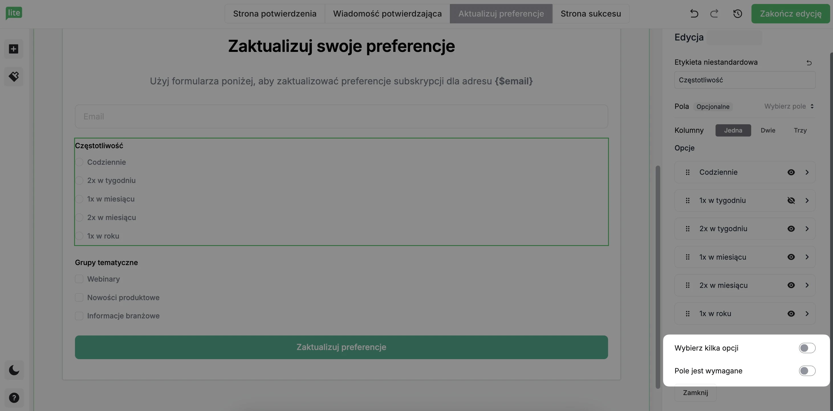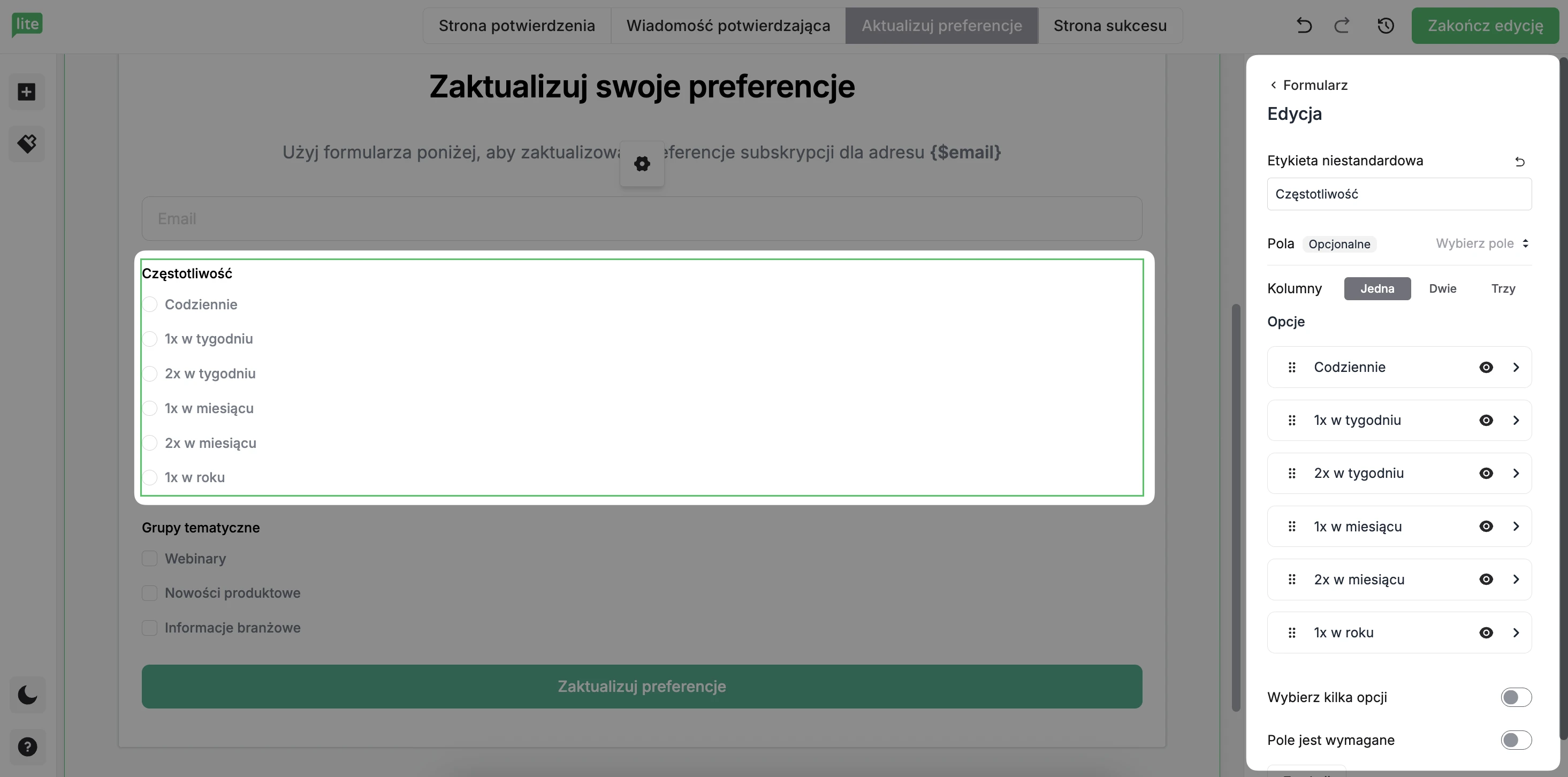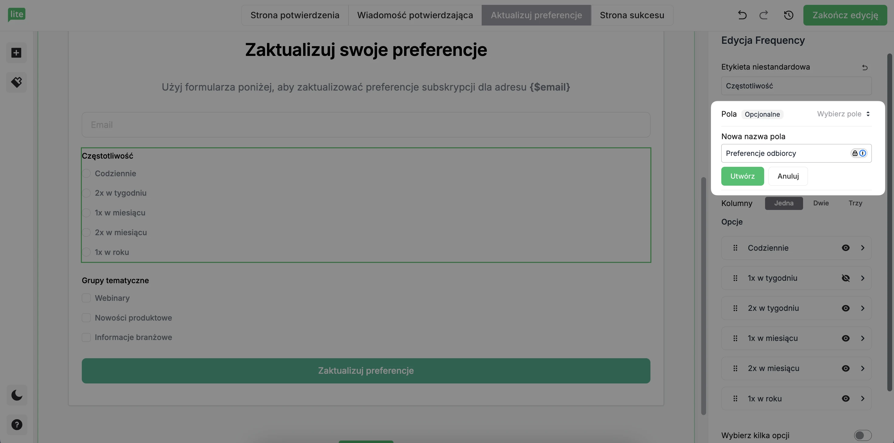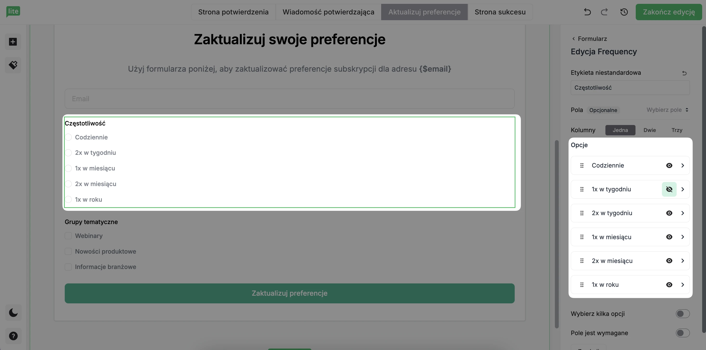 W sekcji Częstotliwość edytuj opcje, dzięki którym odbiorcy mogą wybrać, jak często chcą otrzymywać wiadomości od Ciebie.