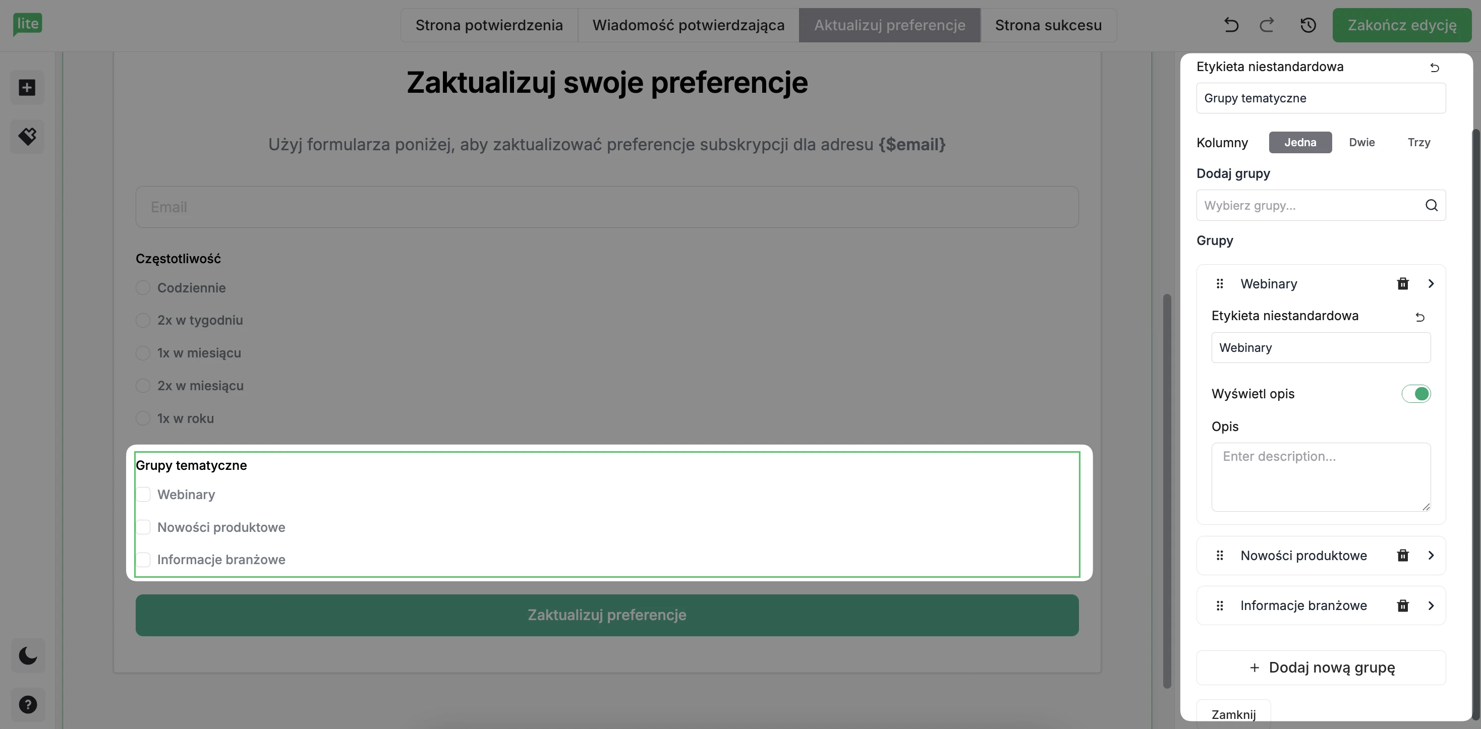 Opis: Możesz również dodać opis do każdej grupy, który pomoże wyjaśnić, jakie wiadomości e-mail będą otrzymywać osoby, które wybiorą daną kategorię zainteresowań.