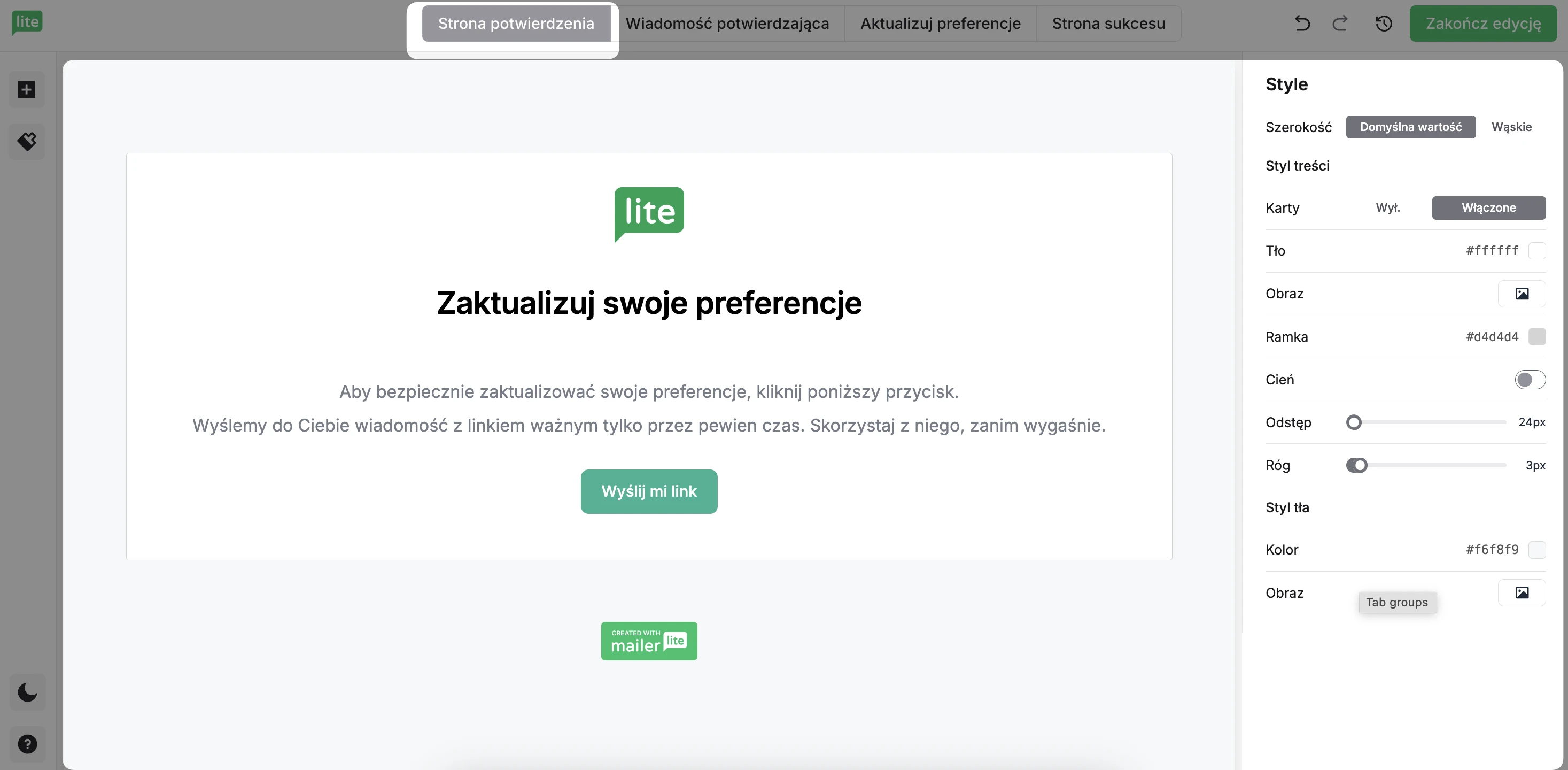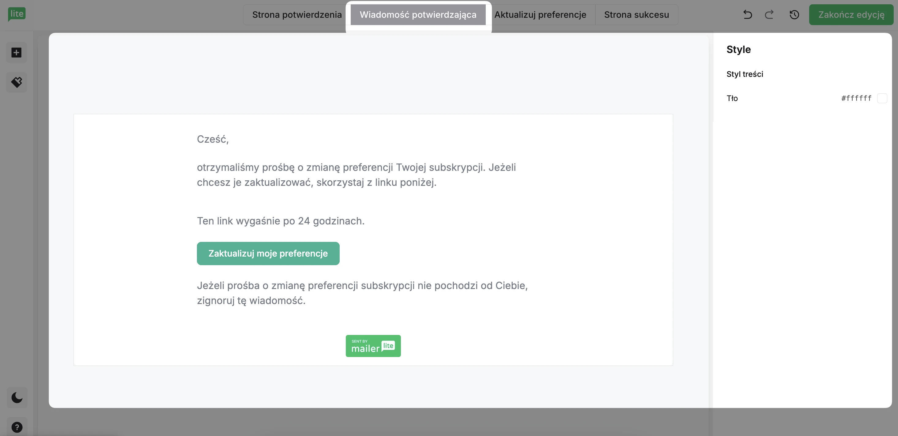 Przejdź do zakładki Strona potwierdzenia, aby edytować stronę, która pojawia się po kliknięciu przycisku “Aktualizuj preferencje” w treści Twojego newslettera.