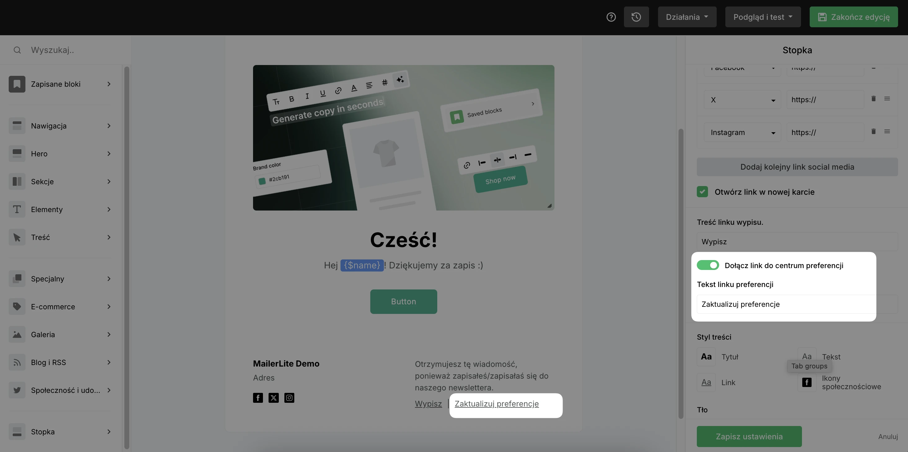 Po edycji Centrum preferencji kolejnym ważnym krokiem jest umieszczenie linku do aktualizacji preferencji w stopce kampanii e-mail.