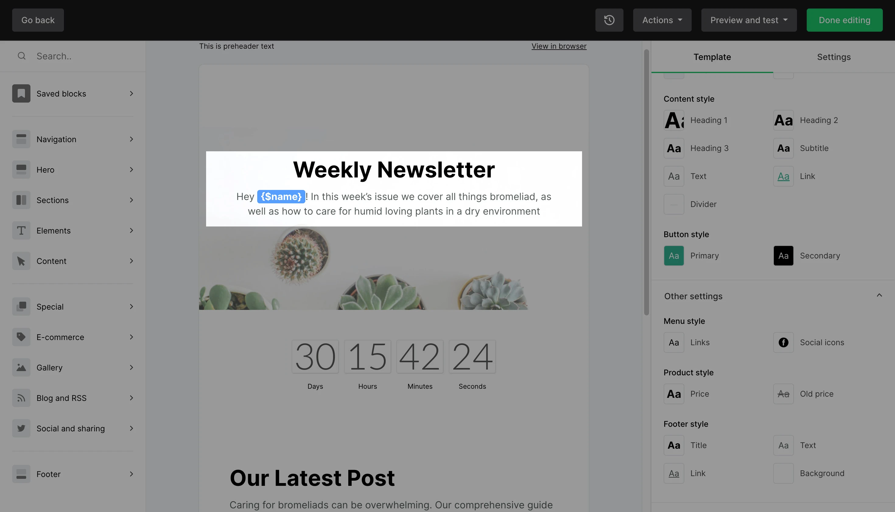 Aby dodać spersonalizowane zmienne do kampanii za pomocą edytora Drag and drop, zalecamy użycie przycisku Zmienna {x}. Pozwoli Ci to wybrać spośród wszystkich dostępnych tagów.