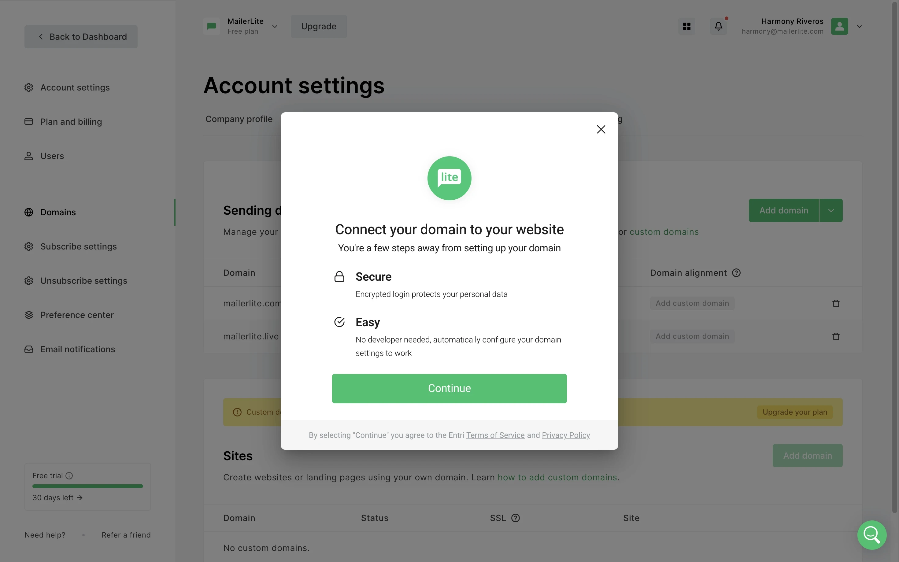 Dodawanie własnej domeny to dodatkowa metoda uwierzytelniania, która pozwala Ci używać własnej domeny w wiadomości email, włączając w to nagłówek e-maila, linki śledzące oraz hiperłącza do obrazów. Jest to zaawansowana, ale opcjonalna funkcja, która pozwala na zwiększenie dostarczalności.