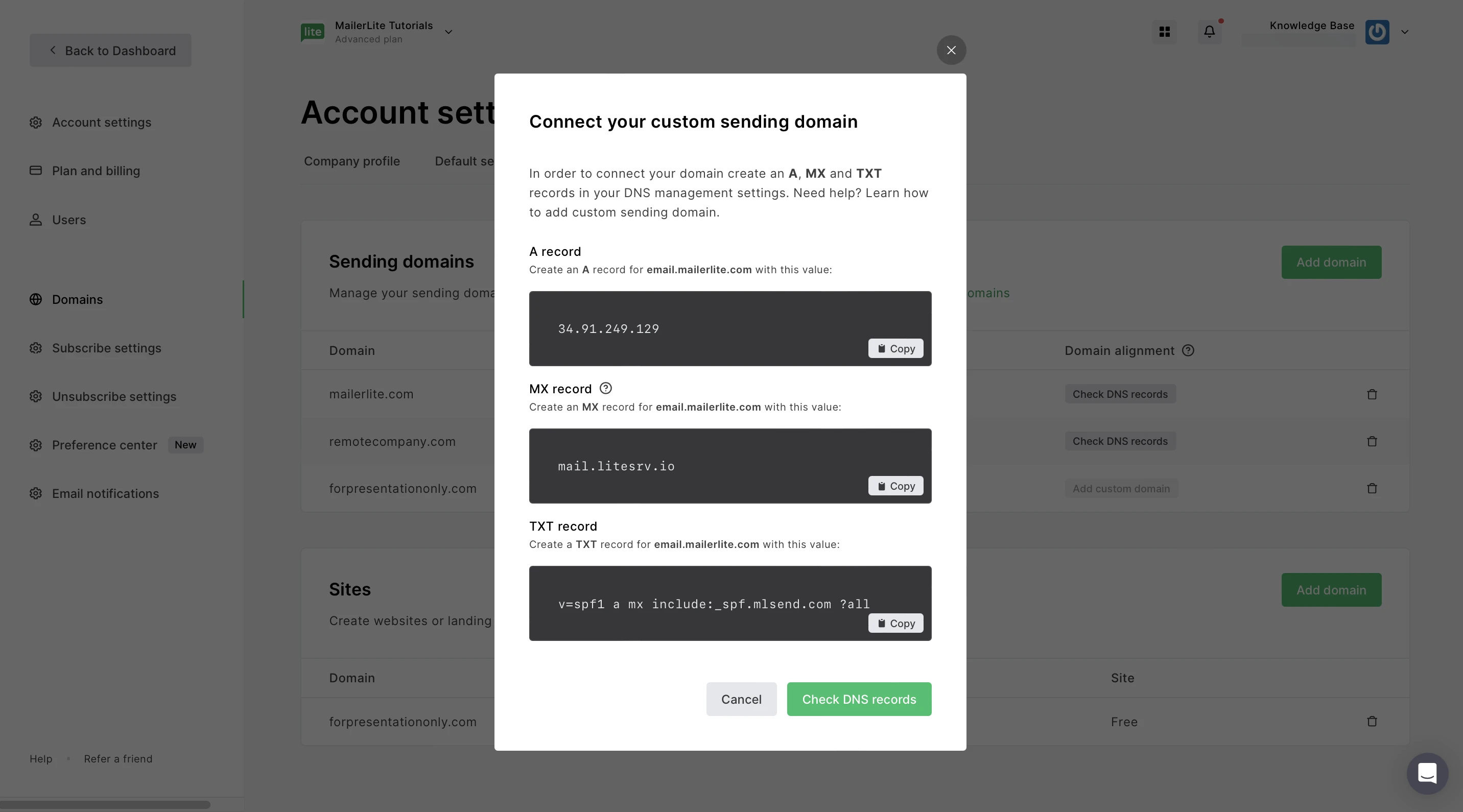 5. Zapisz te zmiany, a następnie kliknij Sprawdź rekordy DNS w MailerLite.