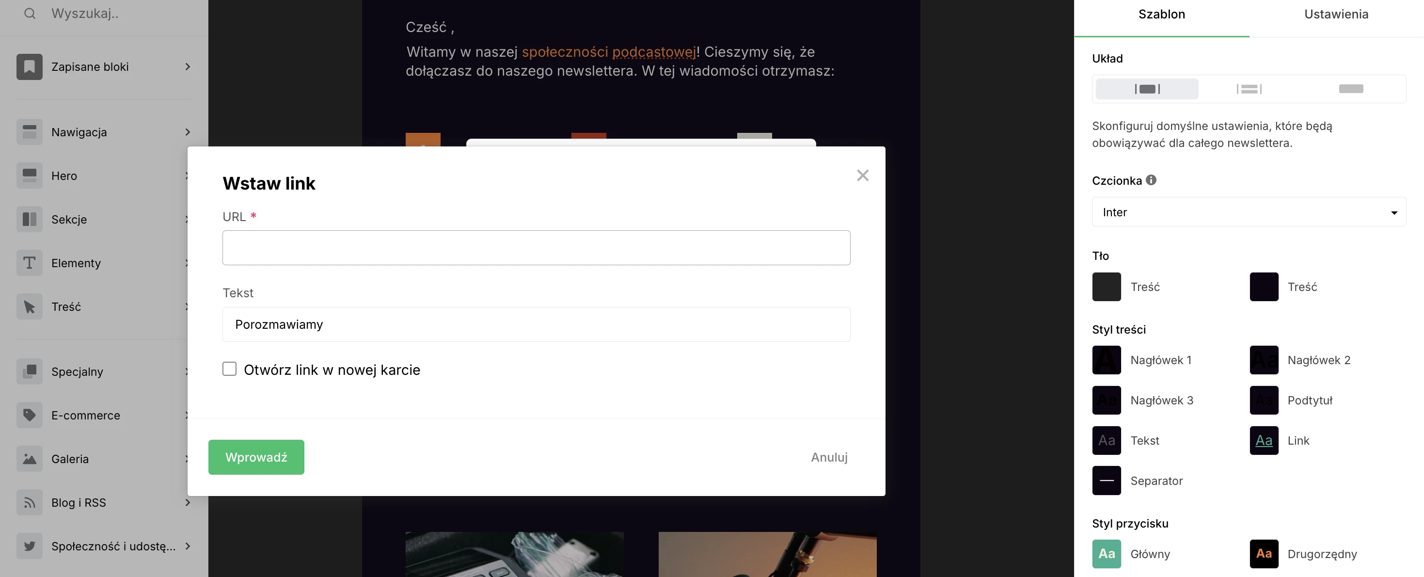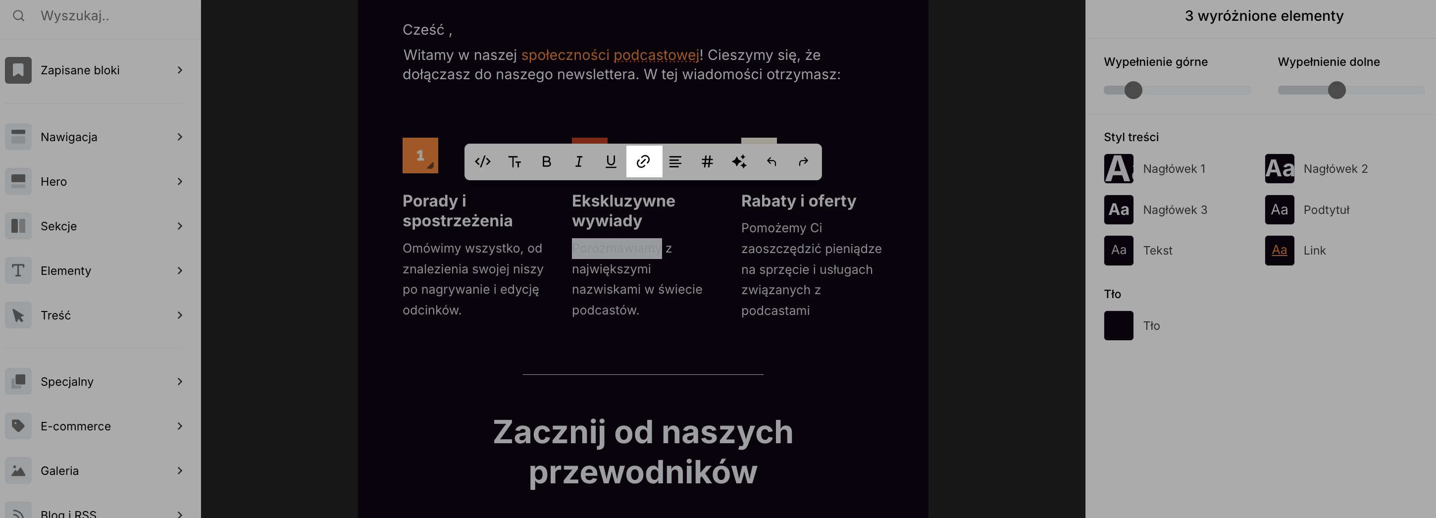Zamiast wyświetlania długich i zagmatwanych adresy internetowych, hiperłącza pozwalają na osadzenie linków w tekście, dzięki czemu treść wyglądają bardziej przejrzyście i profesjonalnie. W MailerLite wstawianie hiperłączy jest bardzo proste!