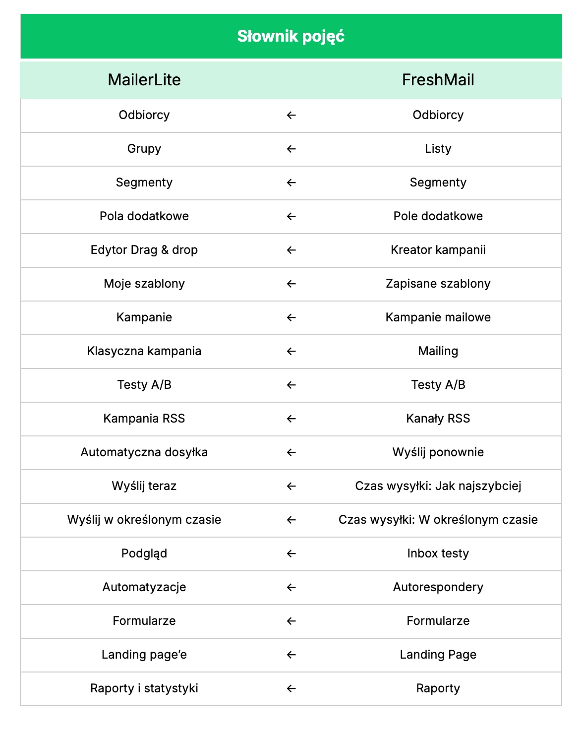Słownik pojęć MailerLite wraz z porównaniem nazewnictwa z FreshMaila.