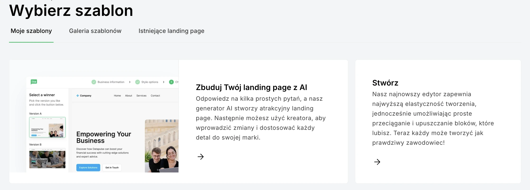 Jeśli chcesz stworzyć landing page, w MailerLite możesz to zrobić wybierając gotowy szablon z Biblioteki, tworząc szablon samodzielnie w kreatorze lub korzystając z generatora AI, który w kilka sekund wygeneruje cały projekt landing page’a opierając się na Twoich wytycznych.