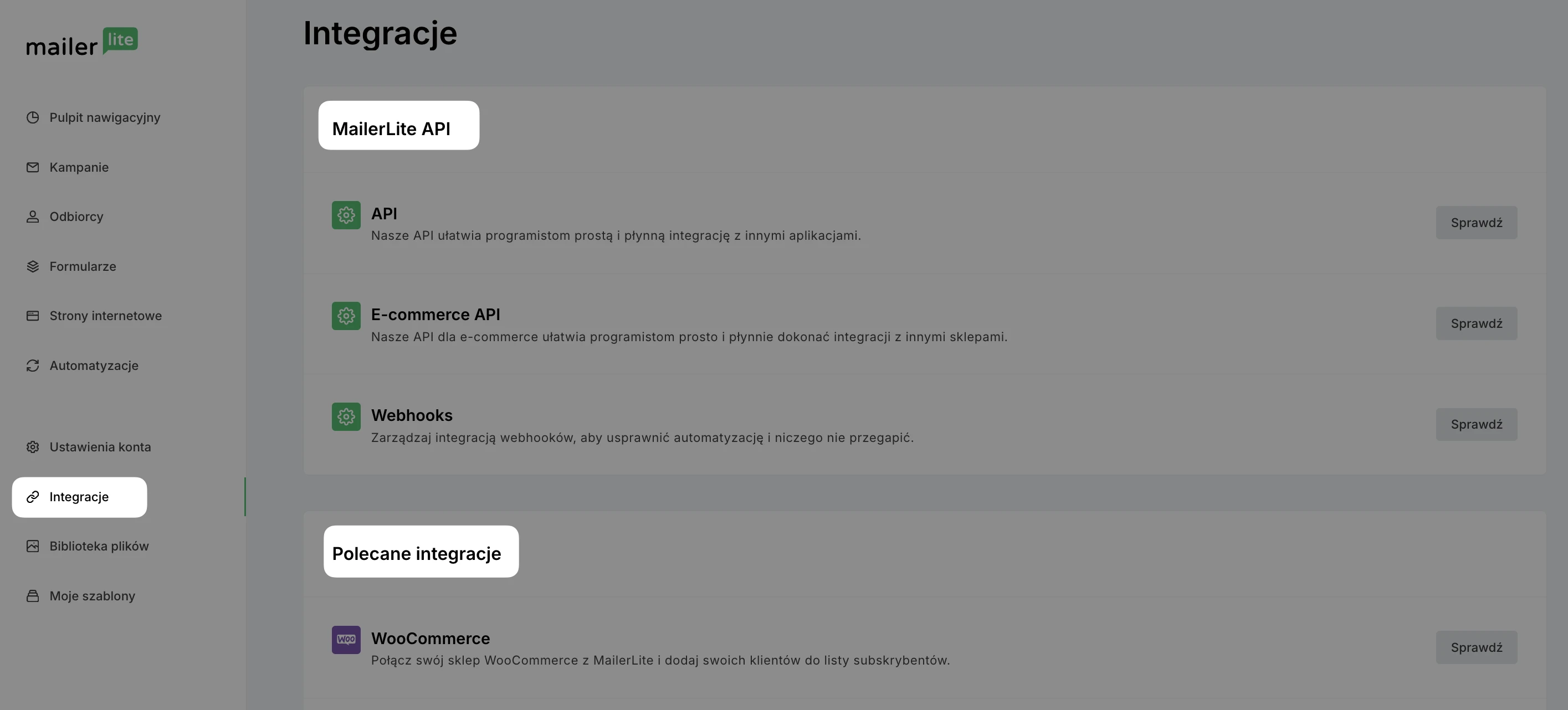 W MailerLite znajdziesz ponad 140 z narzędziami zewnętrznymi m.in. z kategorii e-commerce, CRM, WordPress czy narzędzi pomocnych w codziennej pracy. Shoper, WooCommerce, Shopify, PrestaShop, Zapier, Facebook Audiences, Canva, SalesForce, Intercom, Google Docs, to tylko kilka z nich. Całą listę możliwości znajdziesz w Zakładce Integracje, gdzie dostępne jest też API MailerLite i Webhooksy.