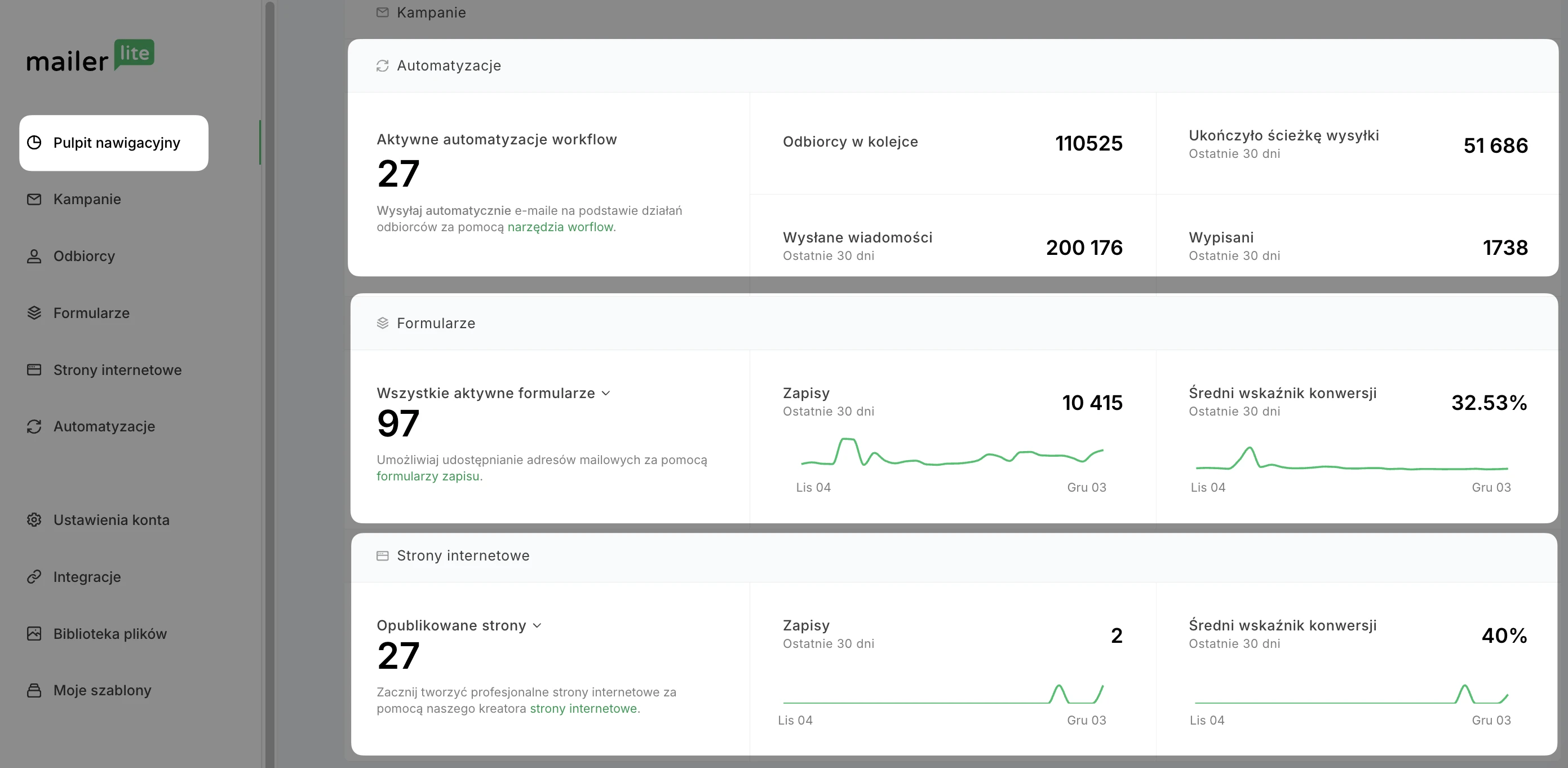 W MailerLite masz dostępne zarówno do raportów z poszczególnych działań, jak i zbiorczych statystyk. Już będąc na Pulpicie nawigacyjnym, czyli głównej stronie po zalogowaniu się na konto, masz wgląd w statystyki z wybranego okresu podzielone na dane na temat odbiorców, kampanii, automatyzacji, formularzy i stron internetowych. Szczegółowe dane znajdziesz również bezpośrednio w danej zakładce po lewej stronie, gdzie dostępne są raporty dla konkretnych kampanii, statystyki aktywności odbiorców czy konwersja formularzy.