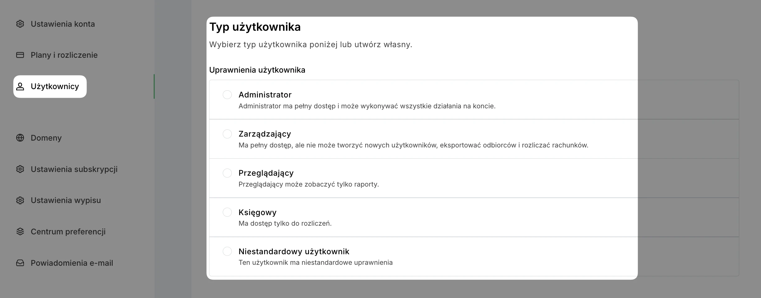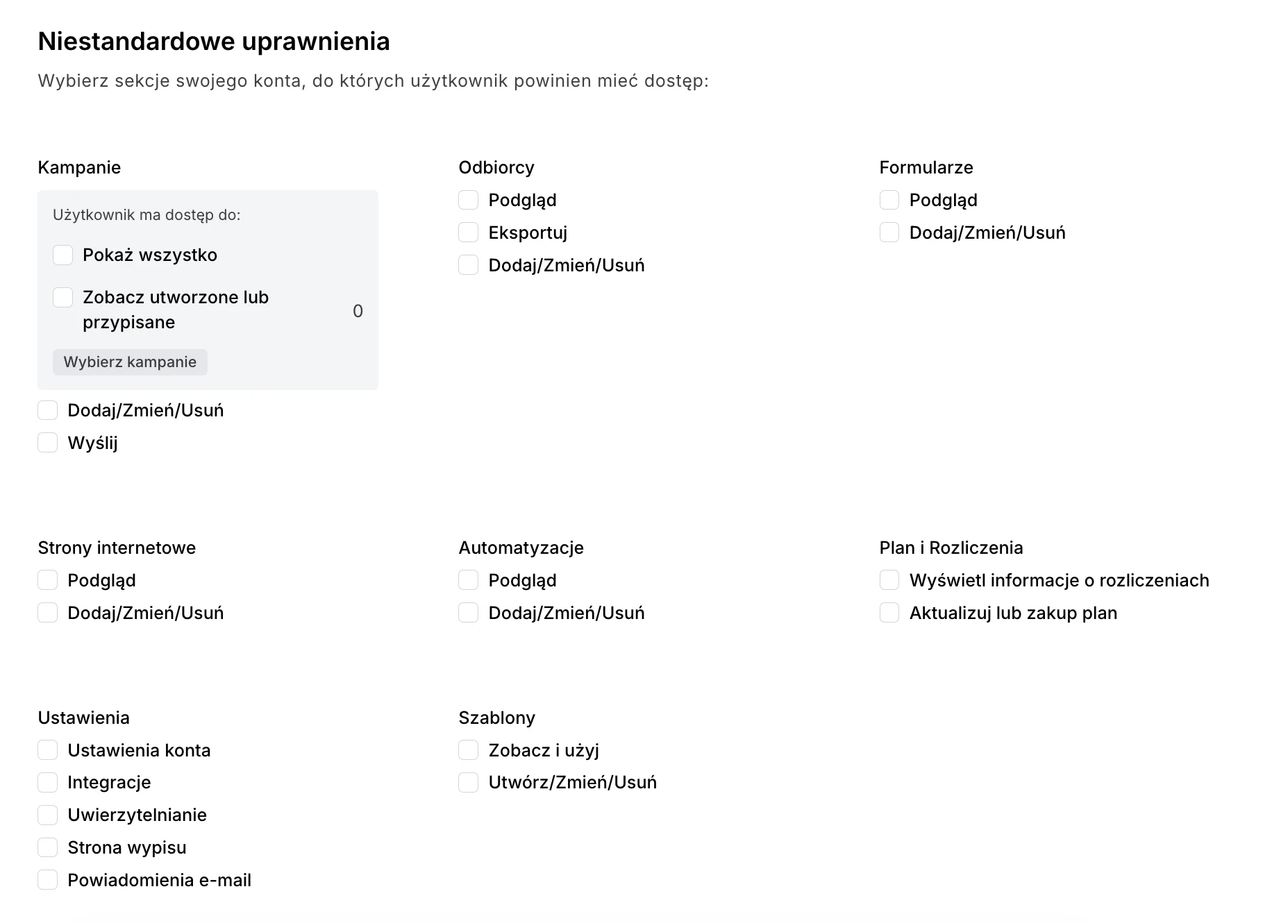 We FreshMailu masz możliwość dodawania kont dostępowych dla współpracowników. W MailerLite dostępni są użytkownicy. Znajdziesz ich w zakładce Ustawienia konta -> Użytkownicy. Do wyboru masz 5 rodzajów uprawnień, które możesz im nadać, w tym typ Niestandardowego użytkownika, przy którym samodzielnie decydujesz, do jakich funkcji ma mieć dostęp i w jakim zakresie.