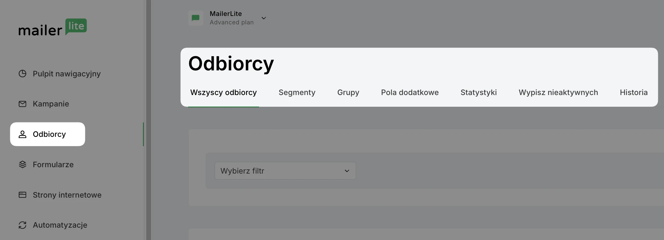 Podobnie, jak we FreshMailu, w MailerLite swoją bazę adresów e-mail znajdziesz pod nazwą Odbiorcy. Zarządzanie nimi daje Ci jednak dużo więcej możliwości!