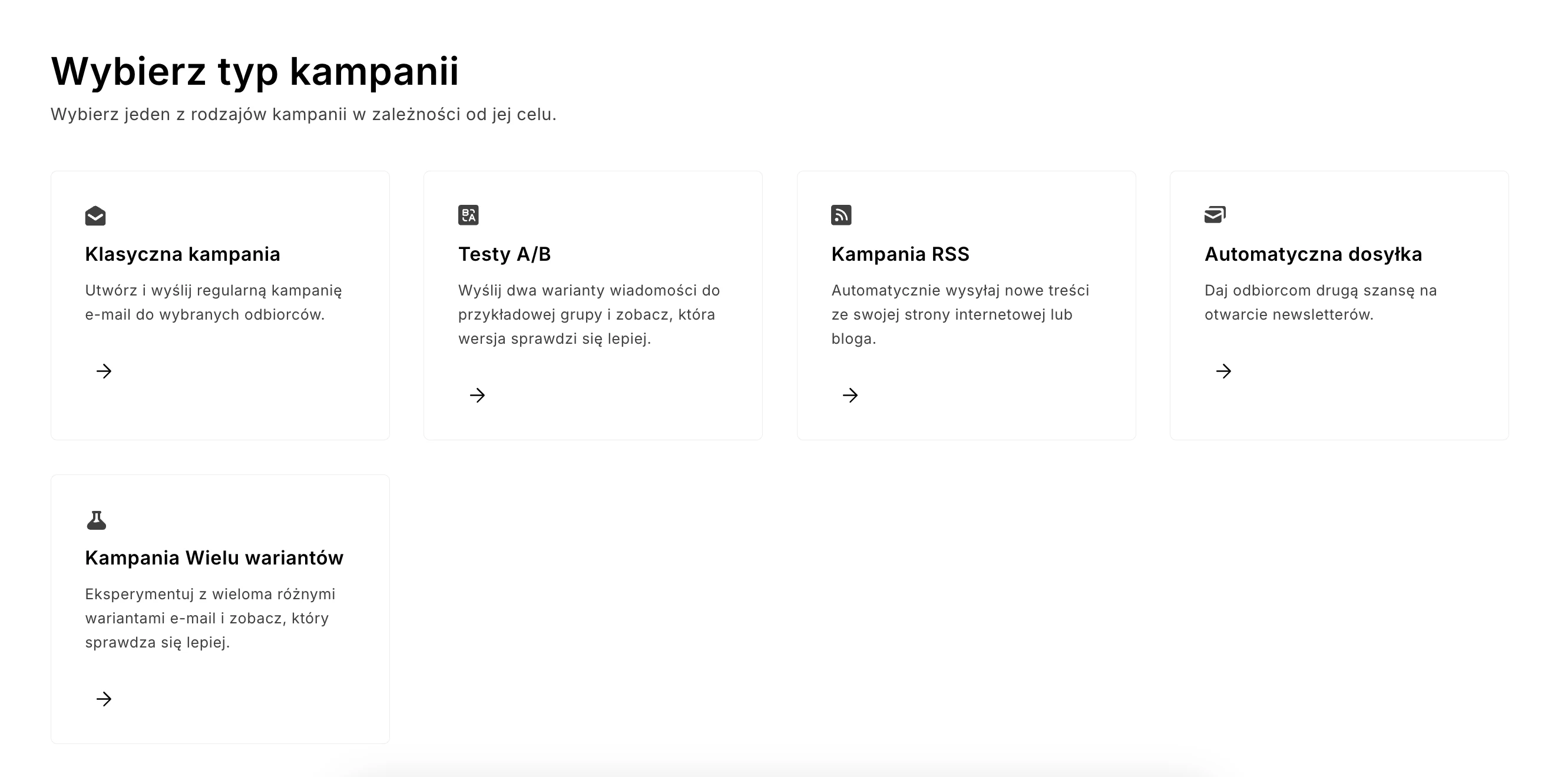 W MailerLite masz dostępnych aż 5 rodzajów kampanii, jakie możesz wysyłać do Twoich odbiorców. Dodatkowo, każda z nich posiada swoje indywidualne opcje.