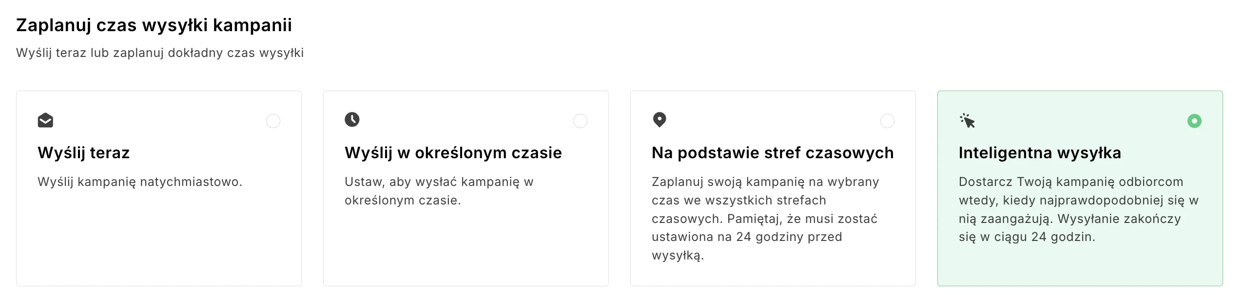 Inteligentna wysyłka: funkcja oparta na AI, która pozwala automatycznie wysłać kampanię oddzielnie dla każdego odbiorcy w czasie, gdy jest najbardziej prawdopodobne, że ten się zaangażuje.