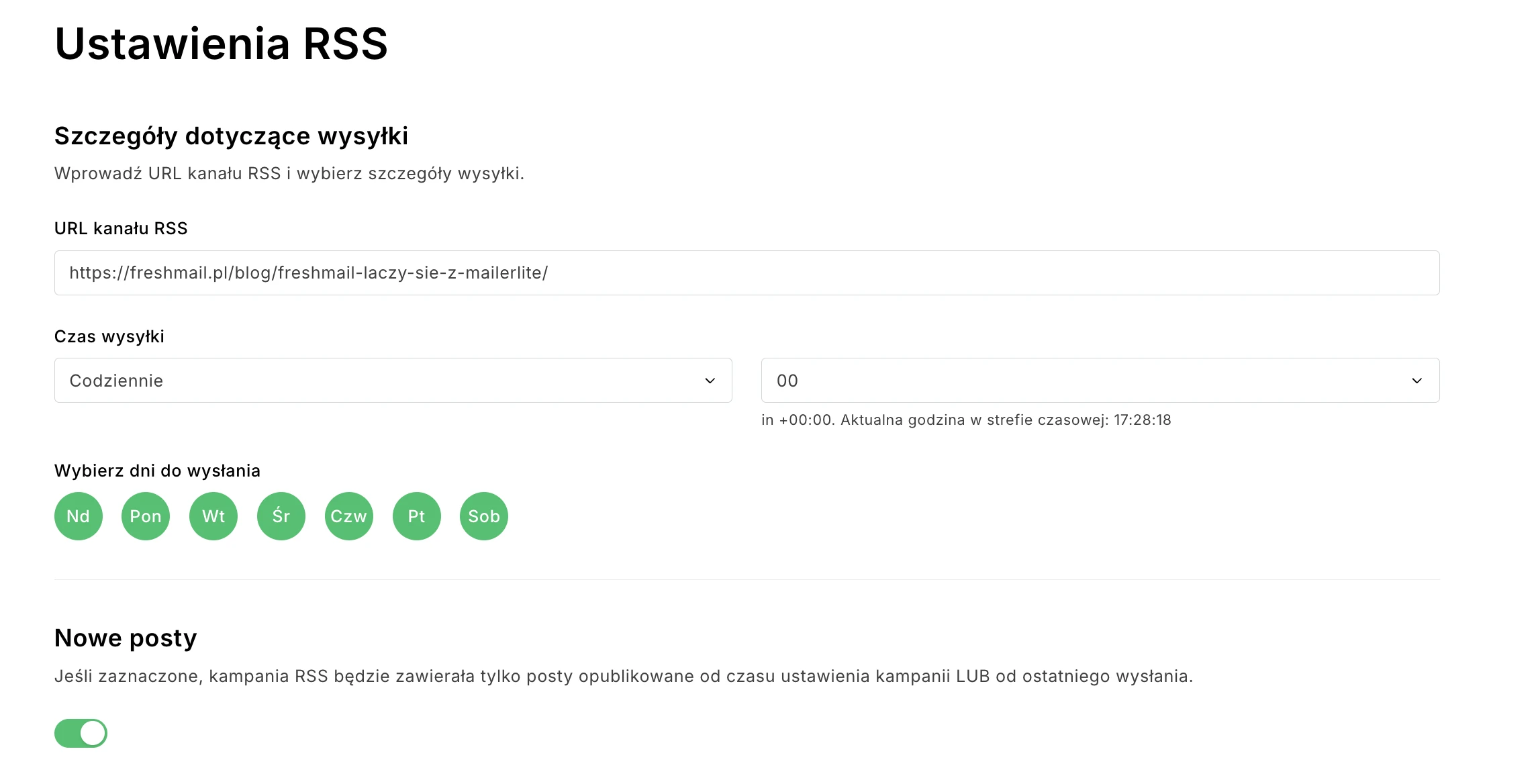 Ten rodzaj kampanii pozwala Ci automatycznie wysyłać aktualizacje z Twojego bloga lub strony internetowej. Możesz wybrać czas or dni wysyłki dopasowując je do częstotliwości publikacji na Twojej stronie.