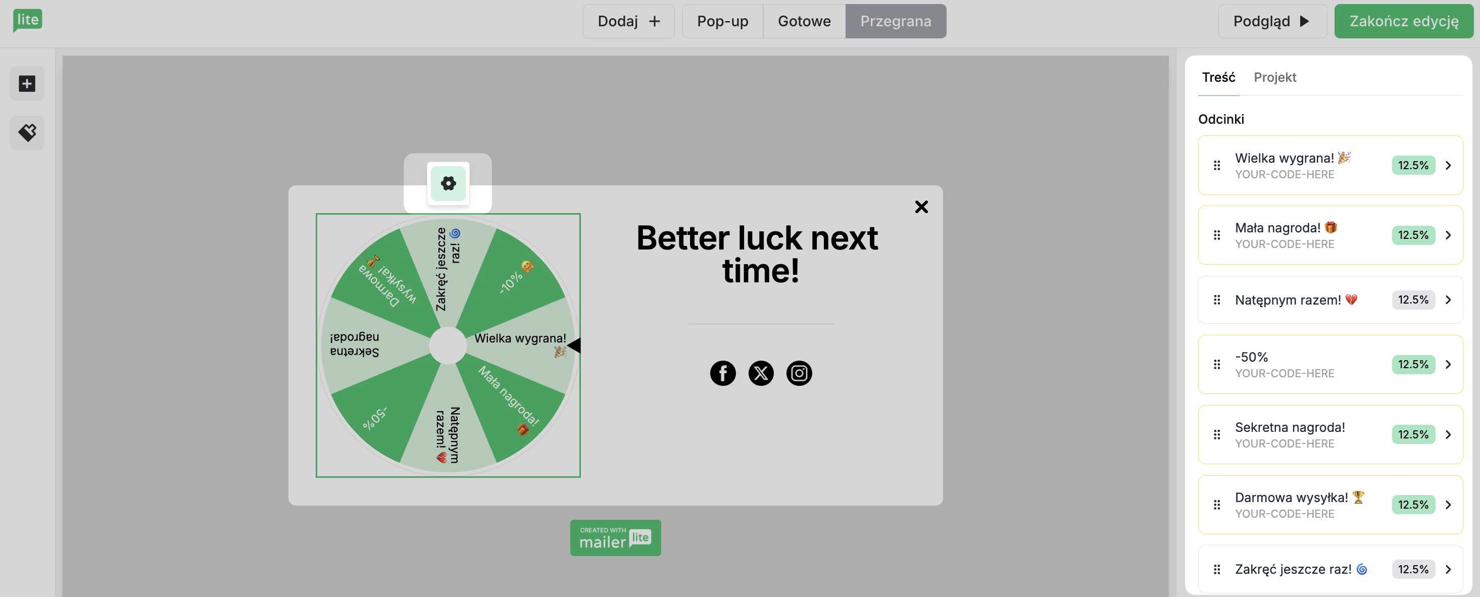 Jeśli koło wyląduje na przegranym wycinku, możesz wyświetlić komunikat „Natępnym razem” lub dowolny inny tekst. Użyj górnej nawigacji, aby przełączać się między tymi trzema widokami i dostosowywać każdy z nich osobno (np. tekst, kolory, obrazy).