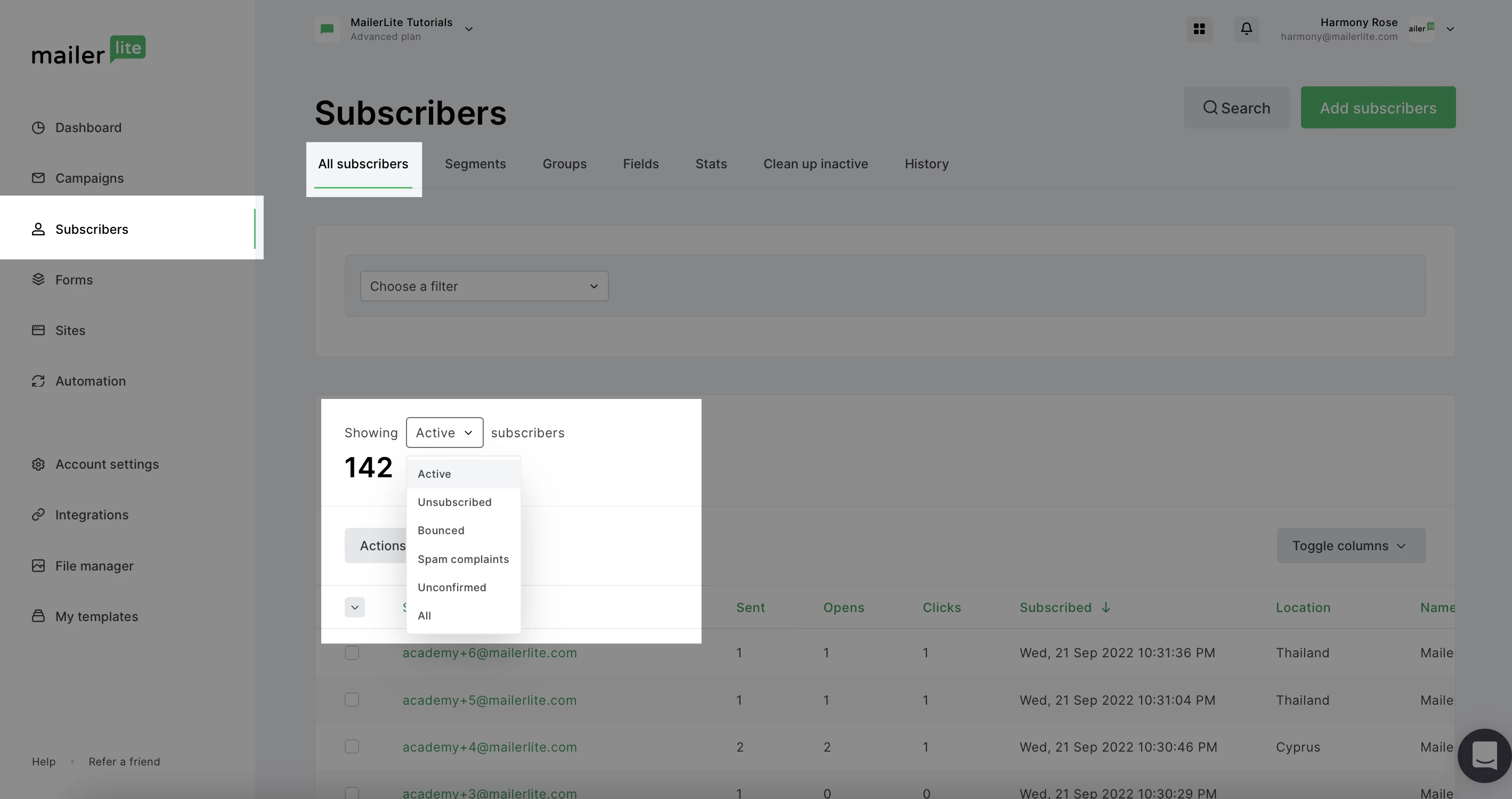 Z poziomu zakładki Wszyscy odbiorcy, kliknij w rozwijane możliwości pod ustawieniami dla filtrów, a zobaczysz opcję wyświetlania każdego typu odbiorcy. Domyślnie, tylko aktywni subskrybenci będą pokazywani.