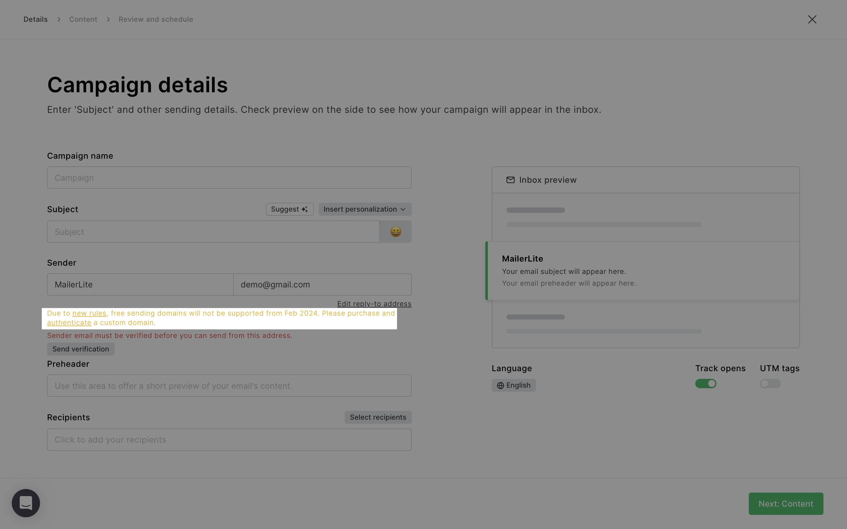 Biorąc pod uwagę nowe zasady, mocno rekomendujemy nadawców e-maili, aby przenieść się z publicznej domeny (takiej jak @gmail.com, @hotmail.com) do własnej domeny. Nie masz jeszcze unikalnej domeny? Nie martw się! Teraz jest idealny czas na to, aby jakąś wybrać. Sprawdź nasz artykuł Jak ustawić własną domenę.