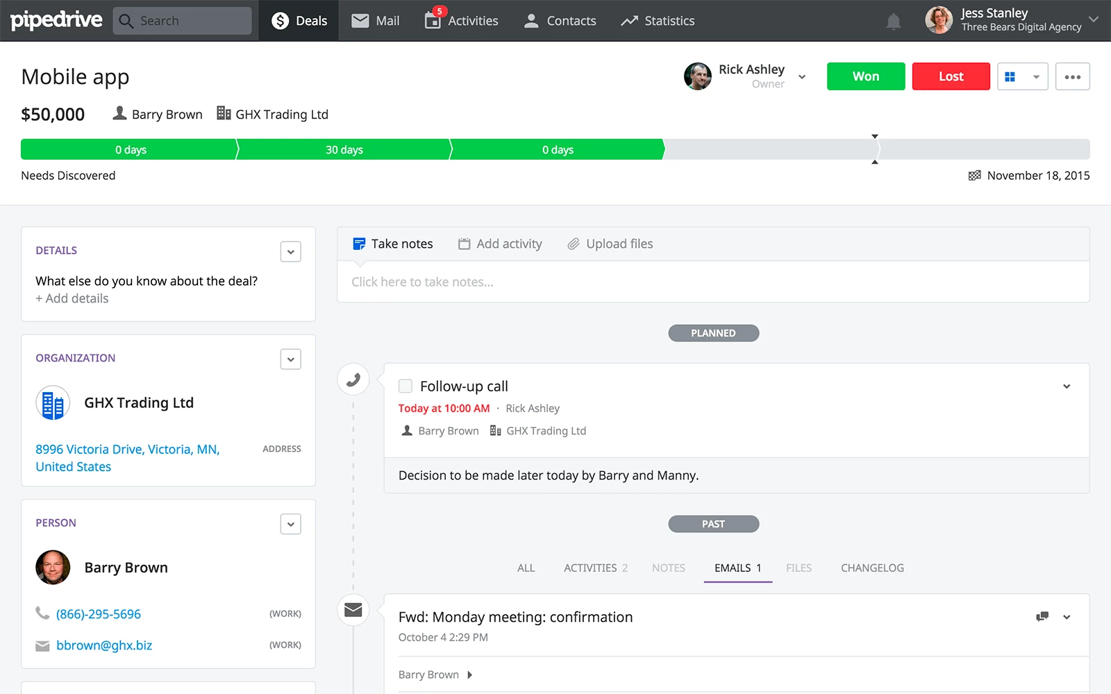 Pipedrive is a customer relationship management system that focuses on activity-based selling. It allows you to manage leads and deals, track communications, automate and expand, and generate analytical insights.