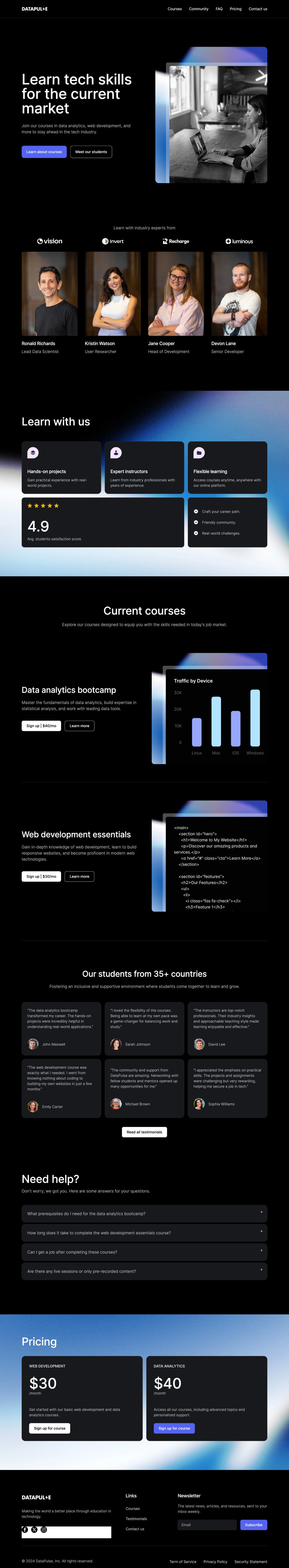 Zachęć do zapisów na Twój kurs online za pomocą naszego szablonu. Wykorzystaj dedykowane sekcje, aby przedstawić program kursu, kluczowe tematy i korzyści płynące z nauki, oraz skorzystaj z naszego intuicyjnego edytora landing page'y, aby dostosować stronę do swoich potrzeb. Prezentuj instruktorów, opinie uczestników oraz przykładowe materiały w eleganckich blokach treści. Utwórz konto MailerLite, aby opublikować landing page promujący Twój kurs online już dziś.
