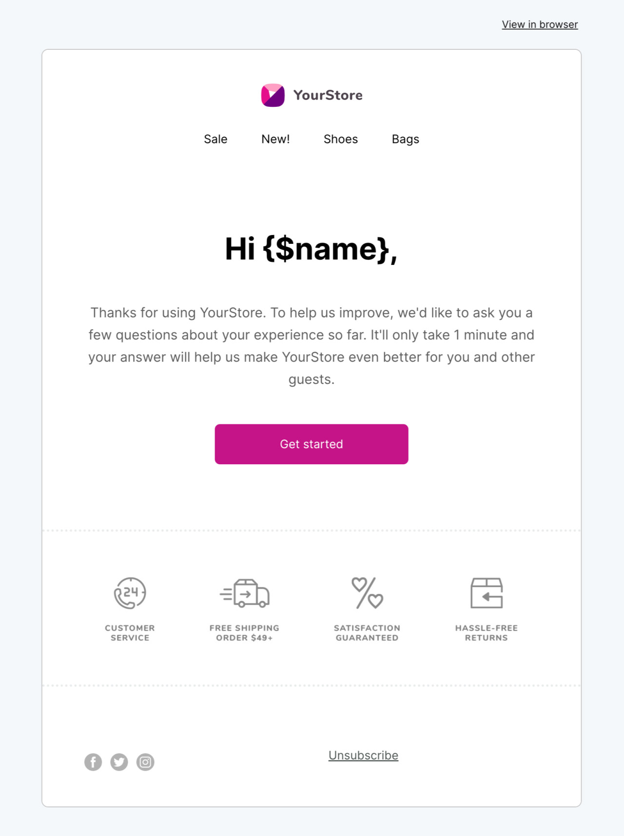 Twórz doświadczenia zakupowe, które budują lojalność dzięki naszemu szablonowi wiadomości e-mail, który możesz wysłać po wykonaniu transakcji. Skorzystaj ze wstępnie utworzonej personalizacji, aby każdy klient poczuł się wyjątkowo.