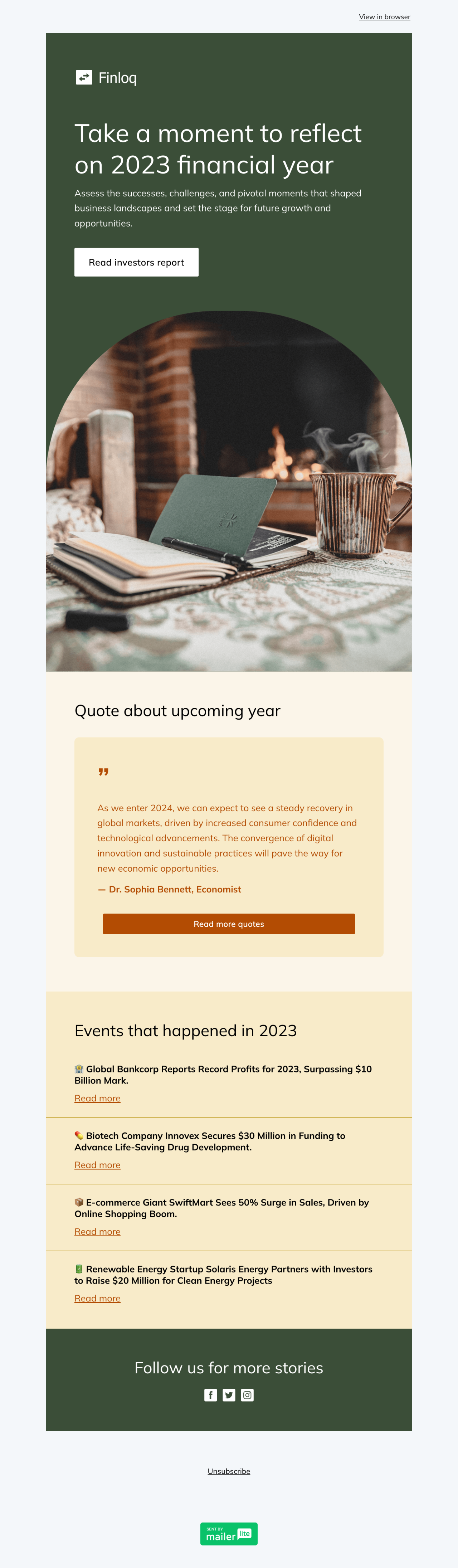 Szablon e-maila Przegląd roku to świetne narzędzie do podsumowania najważniejszych momentów i osiągnięć Twojej firmy w mijającym roku. Zaprezentuj sukcesy, innowacje oraz plany na przyszłość, budując więź z odbiorcami i motywując ich do dalszej współpracy. To doskonała okazja, aby podziękować za zaufanie i zaprosić do wspólnego działania w nadchodzącym roku.
