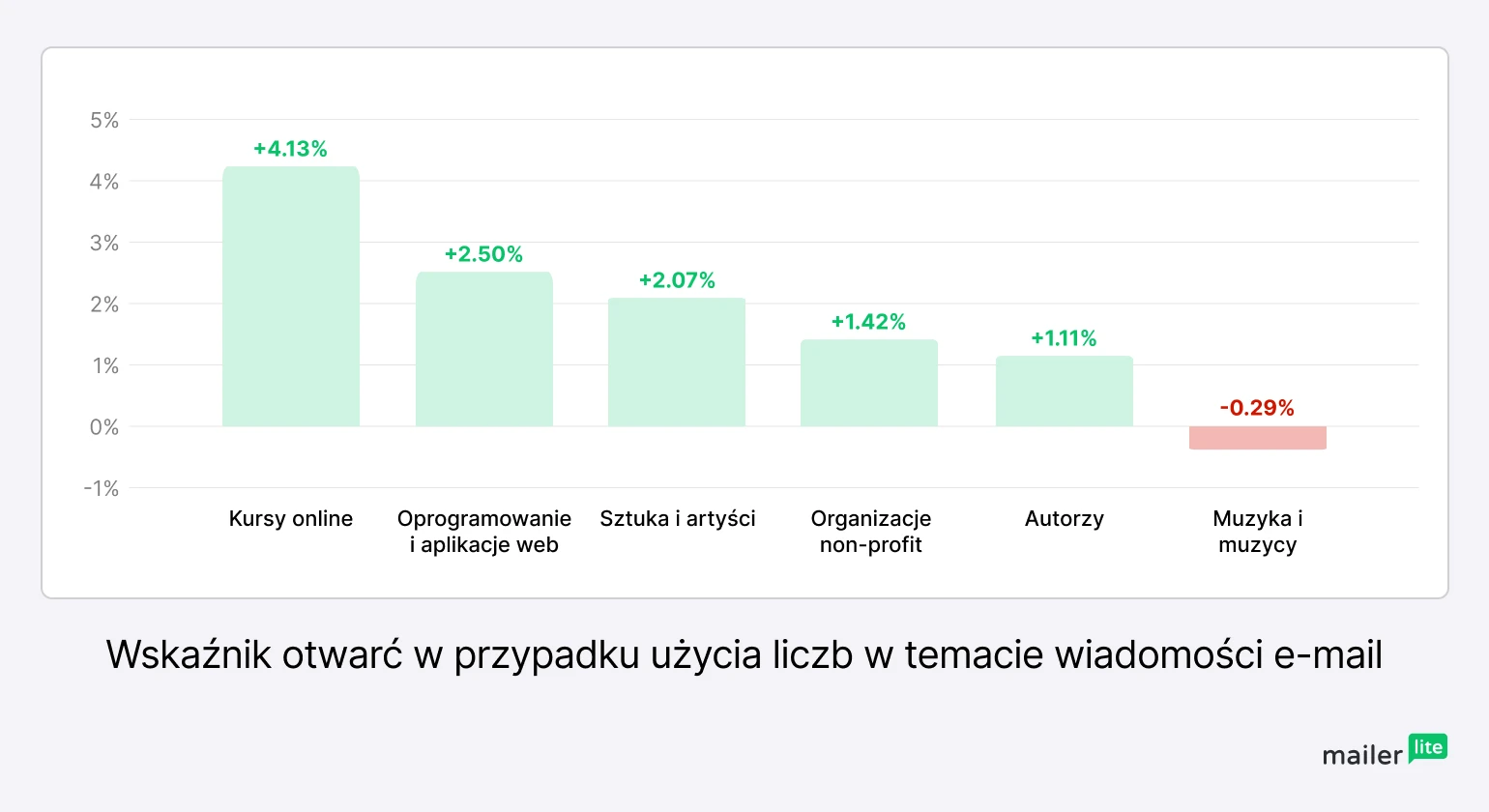 Wskaźnik otwarć znacznie wzrósł (o 2% lub więcej) w przypadku kursów online, motoryzacji, oprogramowania i aplikacji internetowych, technologii informatycznych (IT), polityki i artystów, gdy w temacie wiadomości użyto liczb.