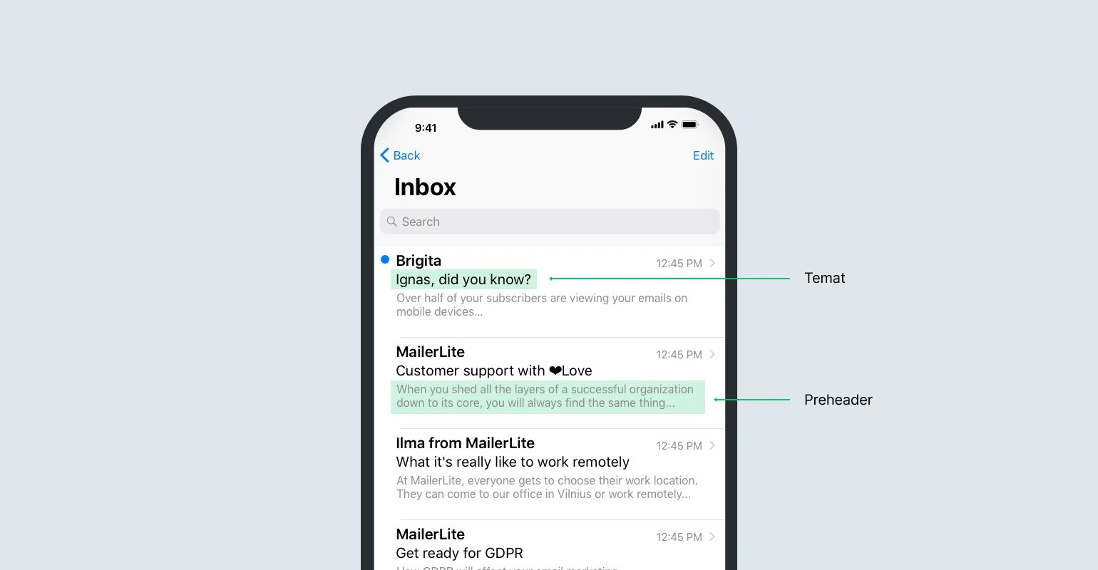 Ponad połowa użytkowników sprawdza pocztę na urządzeniach mobilnych. Parametry tematu różnią się w zależności od urządzenia. Na przykład iPhone ucina temat po 35 znakach, ale za to wyświetla 140 znaków preheadera. Staraj się, by temat nie przekraczał 40 znaków, aby odbiorcy mogli go odczytać na urządzeniach mobilnych.