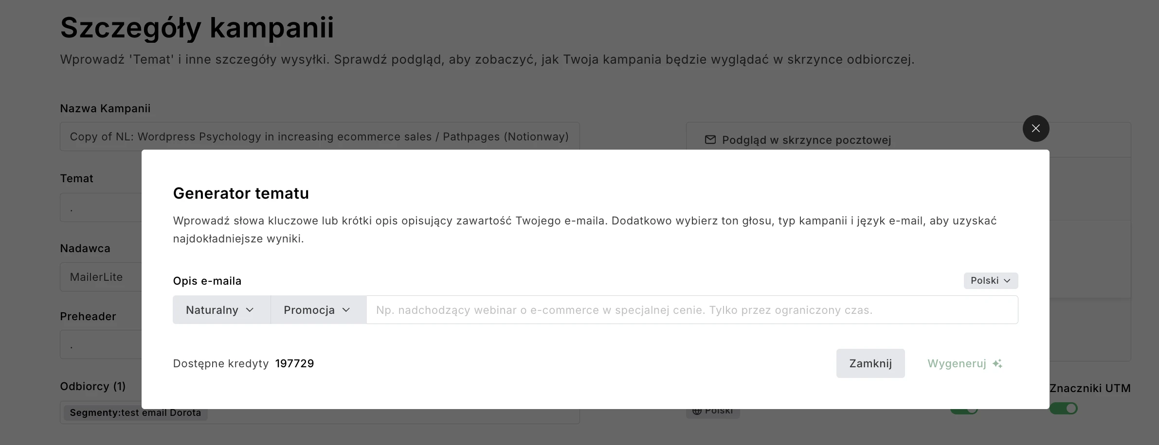 Wymyślanie pomysłowych tematów wiadomości nie jest łatwe. Jeśli akurat nie masz weny, możesz skorzystać ze sztucznej inteligencji, która napisze temat za Ciebie. Masz możliwość wygenerowania treści od nowa lub edytowania tekstu napisanego własnoręcznie, aby utworzyć temat, który z pewnością zachwyci subskrybentów.