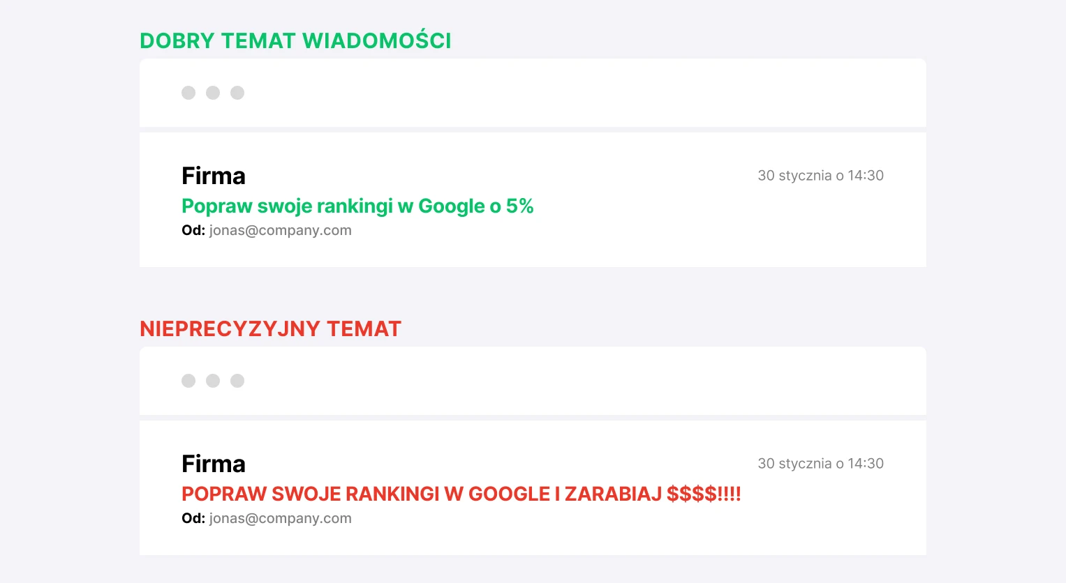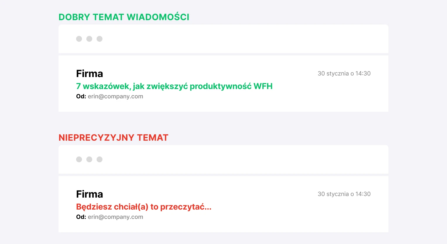 Aby Twój temat był istotny dla odbiorców, musi być konkretny i opisowy. Nie ulegaj pokusie używania chwytliwych zwrotów lub przynęty na kliknięcie, aby uzyskać wyższy Open Rate.