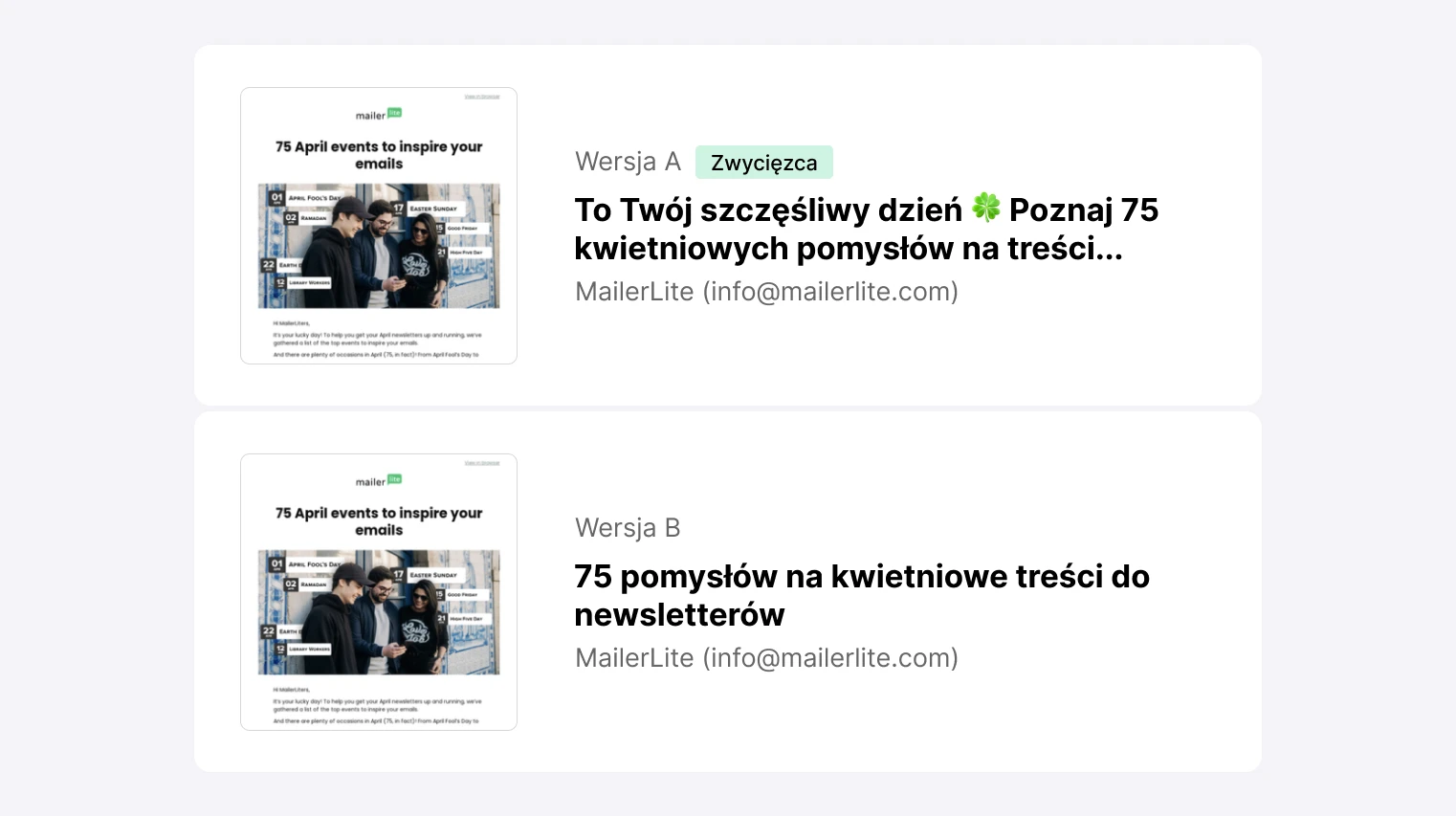 Testy A/B e-maili pozwalają podzielić grupę odbiorców i przetestować dwie różne linie tematyczne. Dzięki temu uzyskasz cenny wgląd w to, co działa, a co nie. A to z kolei sprawi, że w przyszłości stworzysz jeszcze skuteczniejsze tematy niż dotychczas.