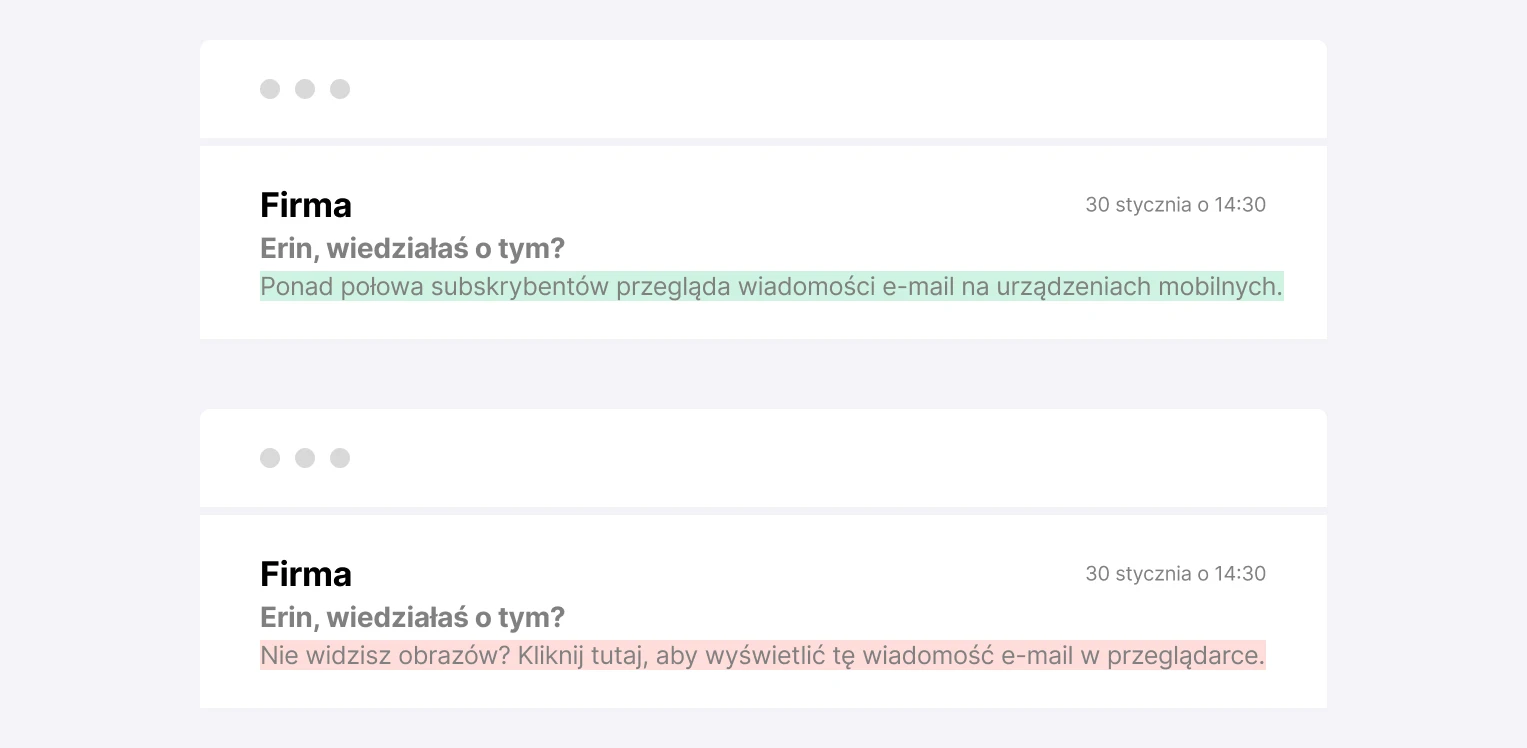 Preheader to pierwsza linijka tekstu, która pojawia się obok Twojego tematu. Jego najleprzy przyjaciel. Nie zapominaj o nim zwłaszcza na urządzeniach mobilnych, gdzie preheader jest często bardziej widoczny niż temat wiadomości.
