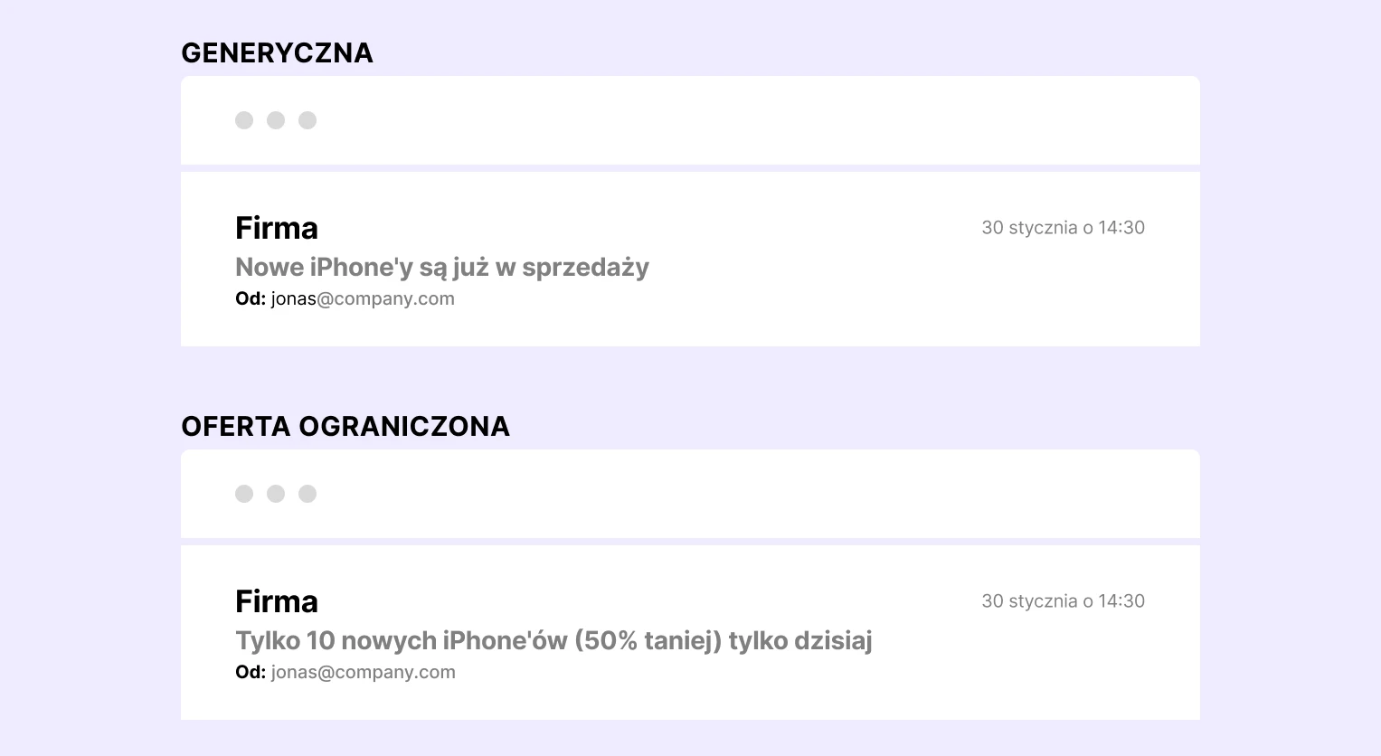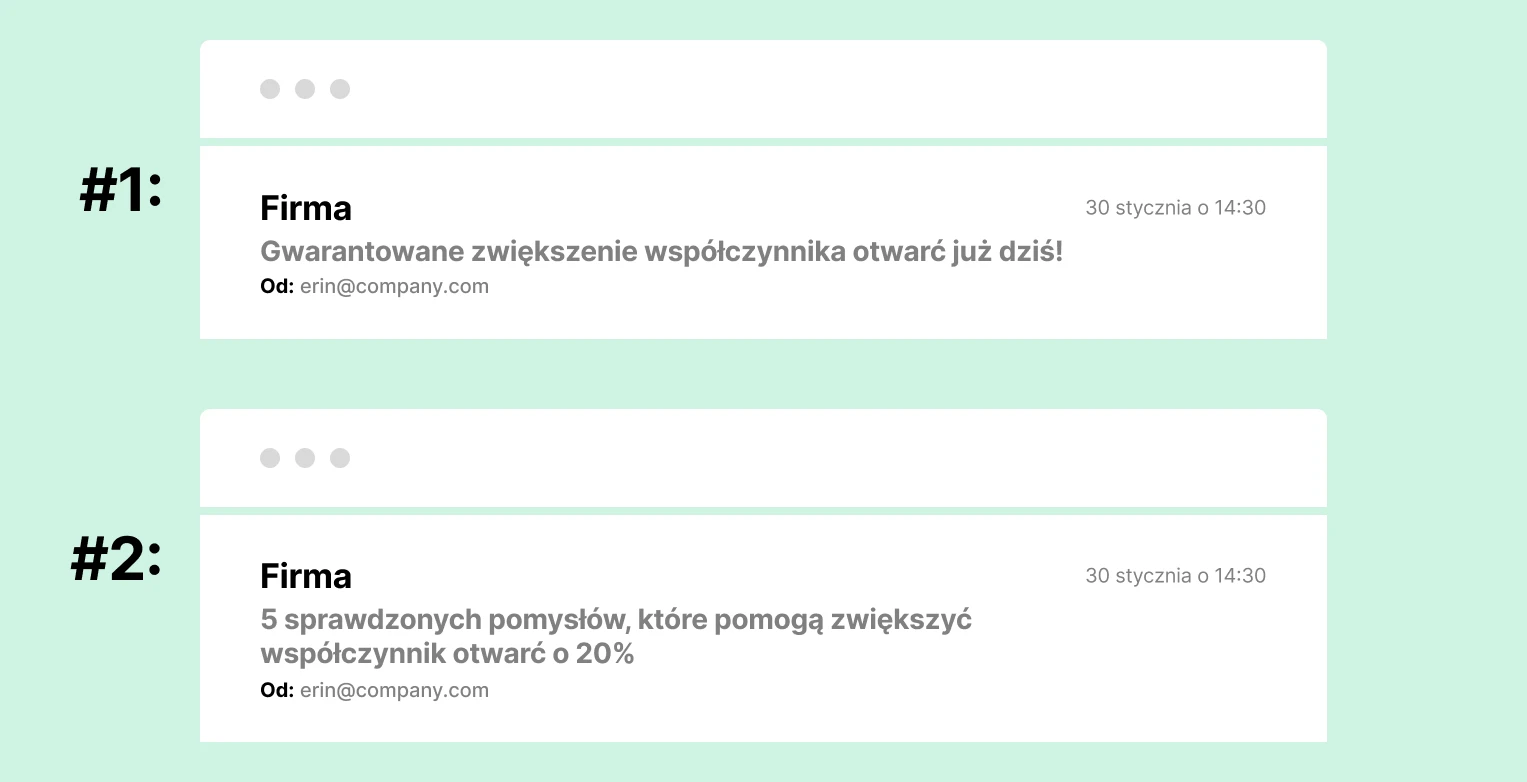 Pierwszy z powyższych przykładów jasno informuje, co zyska odbiorca po otwarciu wiadomości. Drugi przykład to próba wywołania efektu FOMO, ale bez żadnych wskazówek, czego w ogóle e-mail dotyczy i jakie mogą być korzyści z jego przeczytania.