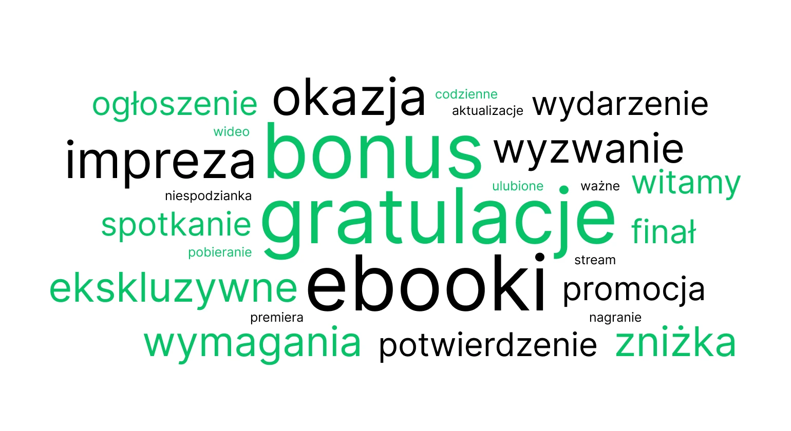 Słowa kluczowe: „witamy”, „ebooki”, „okazja”, „wideo”, „bonus”, „impreza”, „ codzienne”, „aktualizacje”, „wydarzenie”, „wyzwanie”, „ważne”, „niespodzianka”, „spotkanie”, „ogłoszenie”, „finał”, „ulubione”, „ekskluzywne”, „zniżka”, „stream”, „potwierdzenie”, „wymagania”, „premiera”, „potwierdzenie”, „promocja”, „pobieranie”, „nagranie”, „gratulacje”.