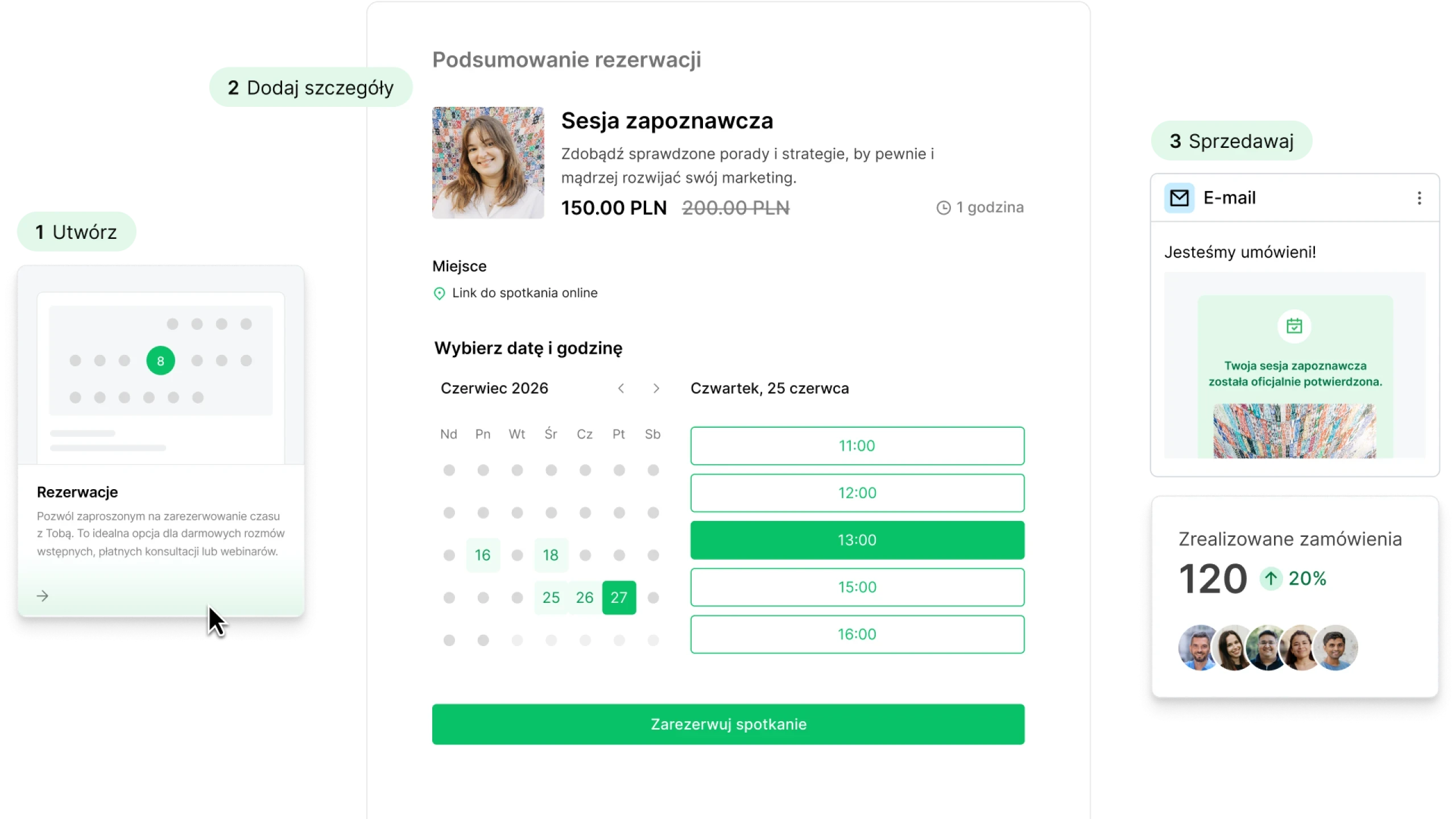 Rezerwacje spotkań i e-mail marketing w końcu w jednym miejscu. Dzięki Rezerwacjom MailerLite możesz oferować bezpłatne lub płatne sesje indywidualne i wydarzenia grupowe, zsynchronizować kalendarz Google lub Outlooka oraz automatycznie uruchamiać sekwencje e-maili w momencie dokonania rezerwacji.