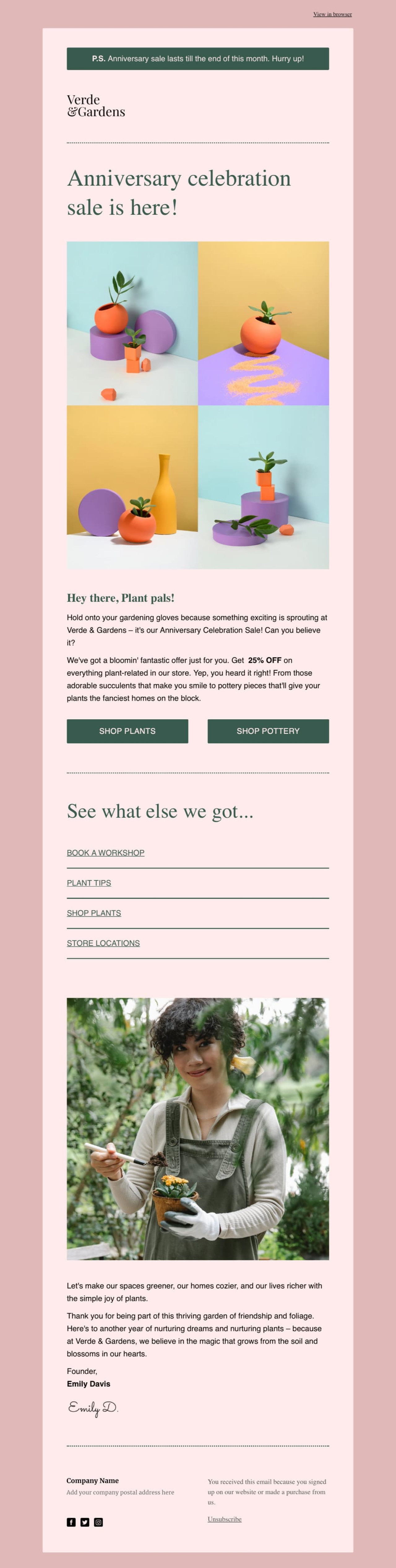 Make your business anniversary a successful one with our anniversary sale template. Promote a limited-time offer with discounts and a fun message. Take a look at our favorite MailerLite e-commerce email templates, choose one and adapt it to your brand personality with the email builder.