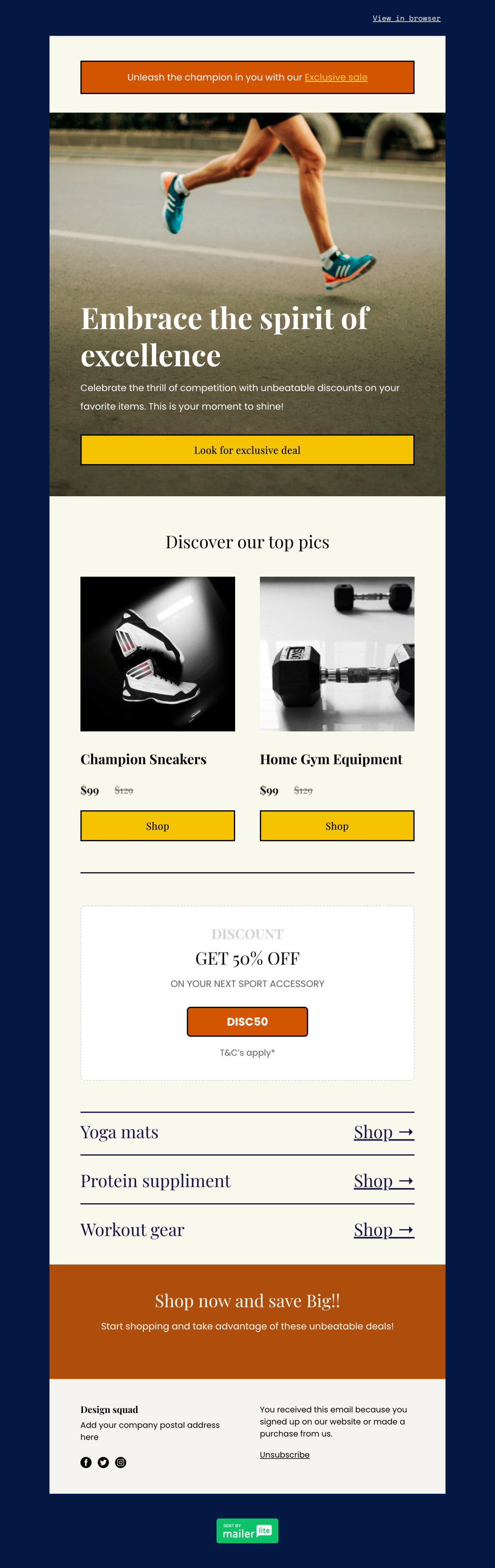 Check out this exclusive sale newsletter template. Browse through our newsletter template gallery, get inspired and start creating your own MailerLite newsletter today.