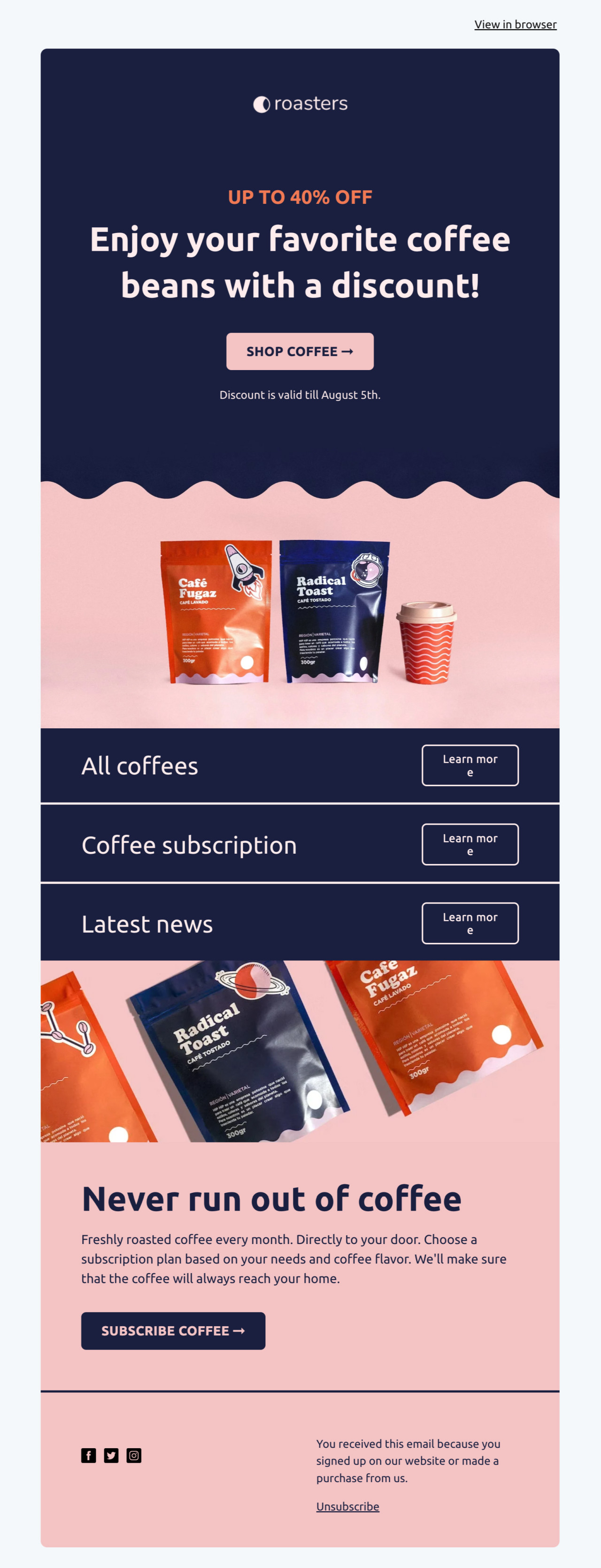 Check out this holiday sale newsletter template. Browse through our newsletter template gallery, get inspired and start creating your own MailerLite newsletter today.
