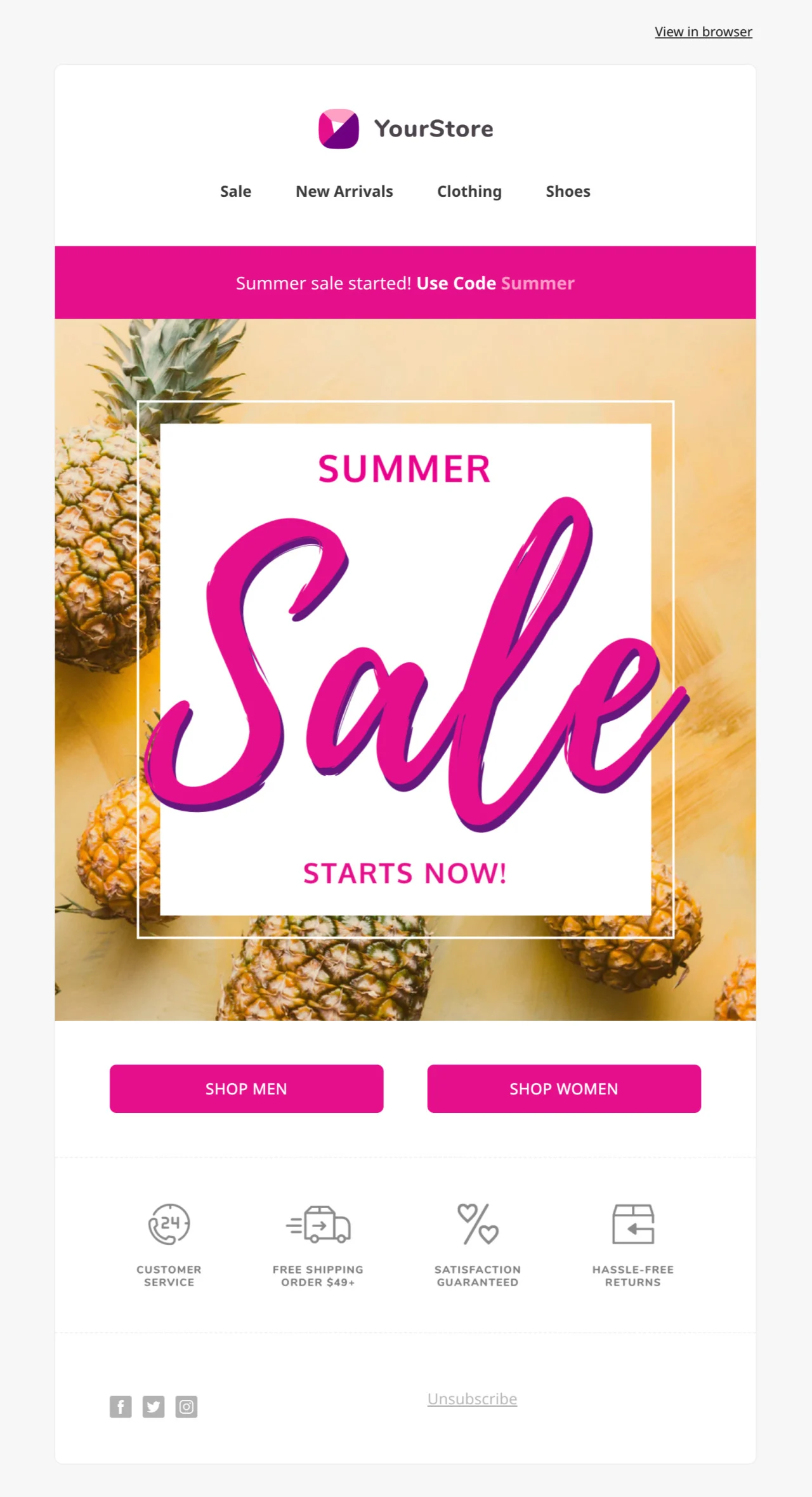 Get more eyes on your offers with our summer sale email template. Quickly customize it with your own discount code and links to your best deals.