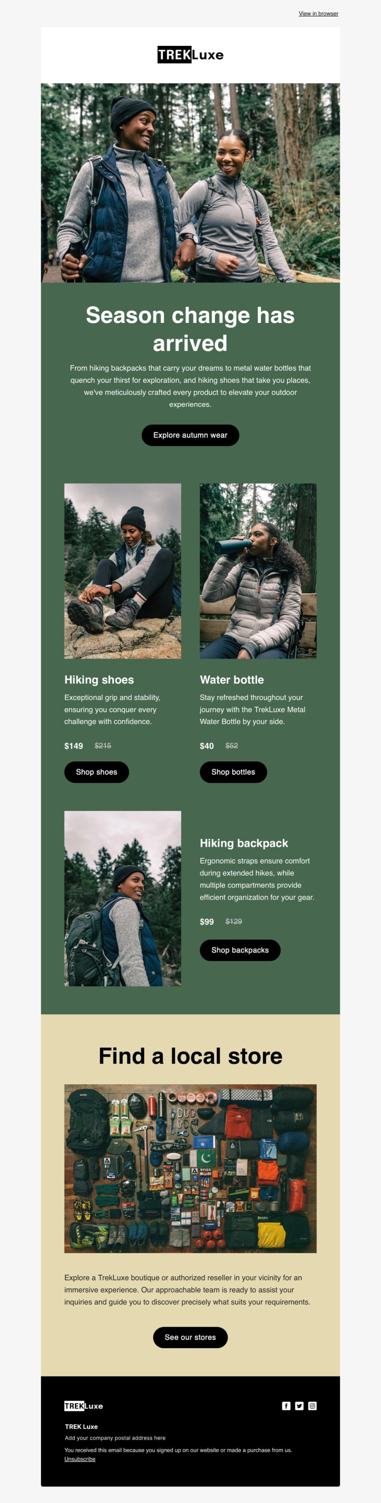 New seasons equals new sales opportunities. Make the most of this period with our end-of-season sale newsletter template. Check out our favorite MailerLite e-commerce email templates, choose one and customize it with the Drag & drop editor.